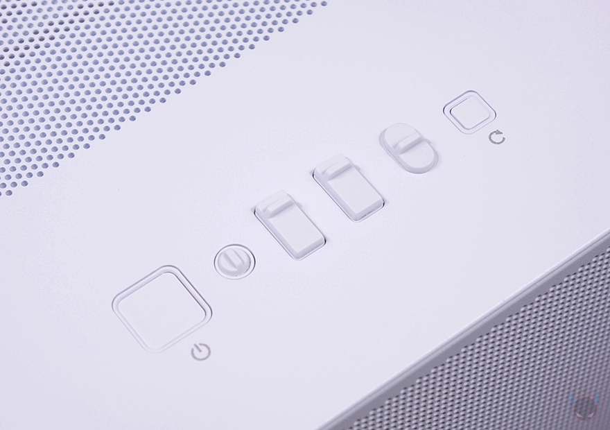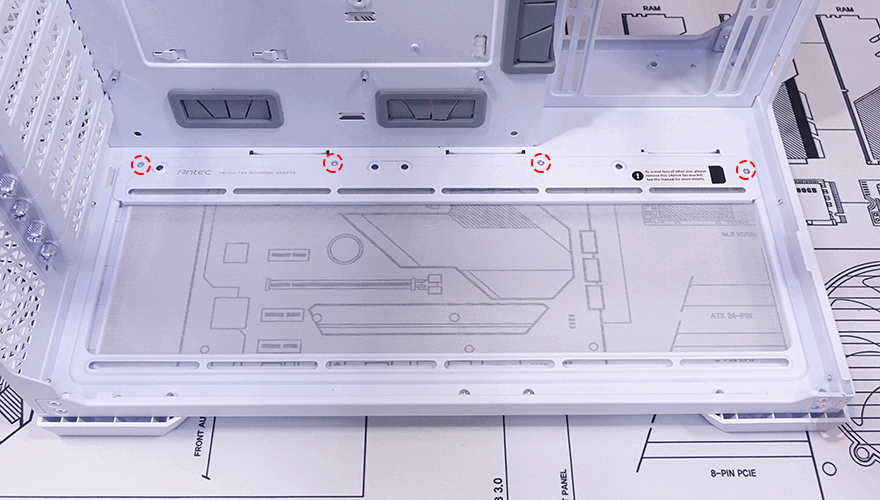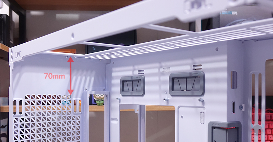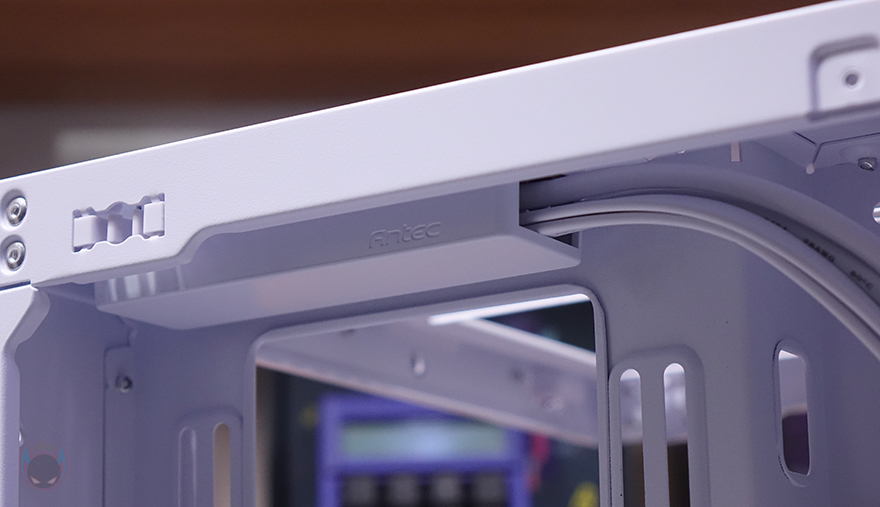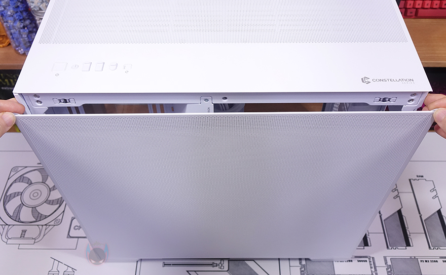 C8 케이스 상단에는 맨 오른쪽 일부를 민무늬 처리와 함께 앞부분에 버튼 및 포트를 배치해 놨는데, 앞부분부터 전원 버튼, EAR/MIC 포트, USB 3.0 포트 2개, USB 타입C 포트 1개, 리셋 버튼순으로 적용했습니다. 특히, 포트들은 모두 기본적으로 케이스 색상에 맞춰 커버를 적용하고 있어서 사용하지 않을 시 먼지 유입 및 부식 방지를 할 수 있고, 커버를 벗겨서 포트 안쪽을 보면 접촉부분도 화이트 색상으로 깔맞춤 해놨습니다. 그리고, 같은 위치로 맨 뒷부분에는 Constellation 시리즈 표기를 해놨습니다. 또한, 맨 오른쪽을 제외한 나머지 부분들은 오른쪽 사이드 패널과 동일하게 작은 에어홀의 메쉬 디자인을 적용했으며, 상단 베젤 역시 후면에 분리-홈을 통해 위로 밀어 올리면서 쉽게 분리할 수 있습니다. 물론, 상단 베젤 안쪽에도 볼헤드-핀을 확인할 수 있는데 역시 오른쪽 사이드 패널과 마찬가지로 작은 헤드를 적용했습니다. 그리고, 패널은 분리하면 내부 상단에 쿨링시스템을 갖출 수 있게 큼지막한 에어홀 처리와 긴 나사홀 처리를 확인할 수 있는데, 팬(FAN) 같은 경우 최대 160mm 팬까지 장착이 가능하고, 160mm 기준으로는 최대 2개, 140mm와 120mm 팬은 최대 3개까지 장착할 수 있습니다. 참고로, 수랭쿨러시 라디에이터 장착은 최대 360mm까지 장착할 수 있죠.