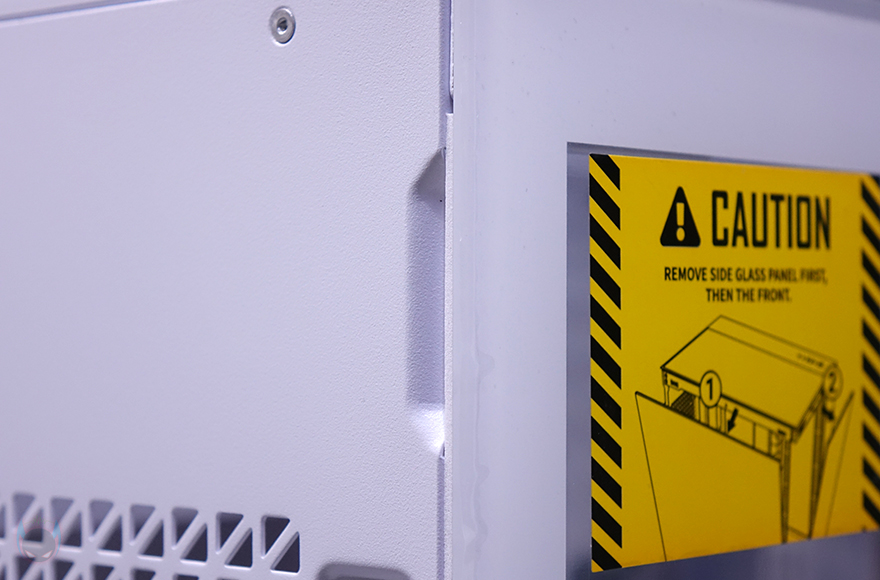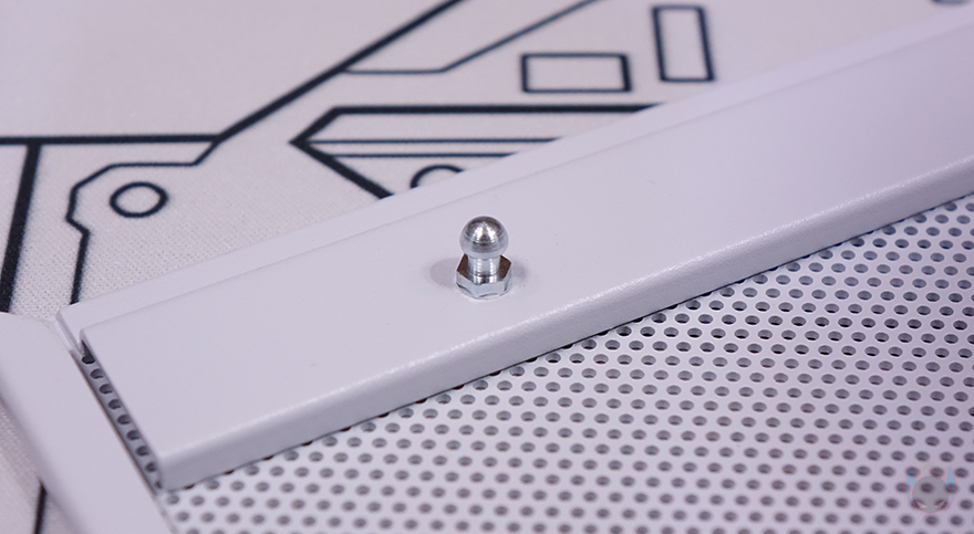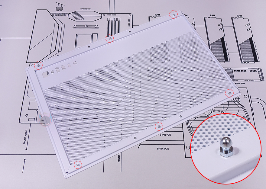 사이드 패널 같은 경우에도 전면기준 왼쪽 패널이 강화유리로 왼쪽 윗부분 모서리 부근에는 주의안내 스티커를 부착해 놨는데, 강화유리 패널 분리 순서를 사이드 패널을 1번, 전면 패널은 2번으로 언급하고 있습니다. 무나사 방식이라 꼭 이 부분을 지킬 필요는 없지만, 가장 안정적으로 분리하는 순서는 사이드 패널 1번, 상단 패널 2번, 그리고 전면패널 3 번순으로 분리하면 됩니다. 사이드 패널 강화유리 역시 후면 윗부분에 분리-홈을 확인할 수 있으며, 역시 윗부분만 앞으로 조금 당기면서 위로 올리면 쉽게 분리가 됩니다. 물론, 사이드 패널 강화유리도 안쪽에 볼헤드-핀과 걸쇠방식을 적용했죠. 그리고, 반대쪽인 오른쪽 사이드 패널은 쿨링시스템 효과를 위해 전체 메쉬 디자인을 적용했는데, 흔히 PC케이스에서 볼 수 있는 에어홀 크기의 메쉬 디자인이 아니라 PC케이스 먼지 필터 구멍크기 정도의 에어홀 디자인으로 적용했습니다. 그래서, 흔히 말하는 환-공포증은 없겠습니다. 오른쪽 사이드 패널 역시 분리는 무나사 방식으로 같고, 강화유리 패널과 조금 차이점이라면 볼헤드-핀 크기가 약간 작습니다. 이는 아무래도 샤시 패널이기 때문에 위험성도 적고 장착 시 충격발생 크기도 작게 하기 위함이라 볼 수 있죠.