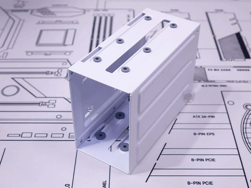 메인보드 트레이 후면 공간에는 측면 쿨링시스템의 공기흐름에 방해가 되지 않게 에어 덕트 파티션을 적용하고 있는데, 동시에 케이블 정리 공간과 구분되는 역할도 합니다. 물론, 위아래 고정나사를 풀면 쉽게 분리를 할 수 있죠. 그리고, 앞서 언급했듯이 트레이 후면공간에는 파워서플라이와 저장장치가 장착되는 공간인데, 파워서플라이 자리에는 받침대와 함께 널찍한 패드도 부착되어 있으며, 바로 아래 공간에는 3.5인치 HDD를 장착할 수 있는 HDD 베이로 외부 후면에서 고정나사를 풀면 분리가 가능하고, 수직방향으로 최대 2개까지 장착할 수 있으며, 제공되는 전용 나사를 사용하면 됩니다. 그리고, HDD 베이 자리 아래 공간에는 2.5인치 HDD/SSD를 장착할 수 있는 브라켓이 장착되어 있는데, 같은 위치에 반대편 그러니깐 내부 상단에도 동일한 브라켓이 1개 더 장착되어 있습니다. 브라켓은 손나사로 고정되어 있어서 쉽게 분리할 수 있으며, 브라켓당 2.5인치 HDD/SSD를 2개씩 최대 4개까지 장착할 수 있죠.