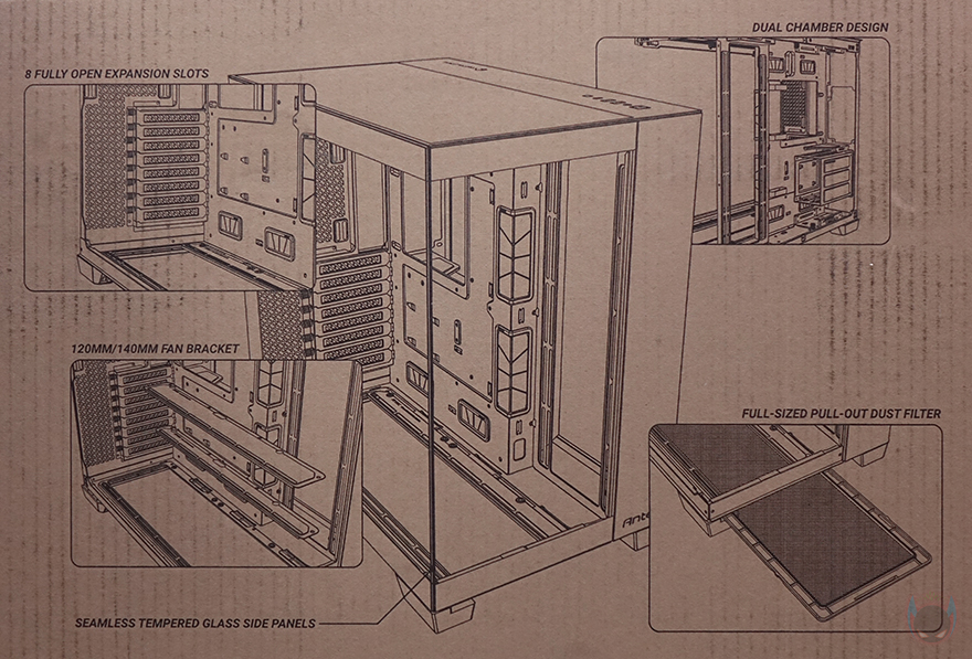 그럼, 본격적으로 Antec(안텍)의 C8 PC케이스를 살펴보는데, 외형부터 살펴보면 색상은 블랙(Black)과 화이트(White) 2가지로 출시했습니다. 그리고, 한눈에 봐도 시작에서 언급했던 파노라마-뷰 케이스에 기준이 되는 강화유리가 전면과 사이드패널 2면에 적용된걸 바로 확인할 수 있죠. 또한, C8 같은 경우에는 뒤에서 확인하겠지만, 파워서플라이가 하단이 아닌 메인보드 트레이 후면에 장착되는 구조로 이런 구조의 어항케이스들은 케이스 너비(W)가 일반 케이스보다 넓습니다. C8 같은경우에는 케이스 너비가 303mm죠. 그리고, 이중 전면에 배치된 강화유리의 너비는 약 222mm를 가졌습니다. 전면 강화유리를 제외한 맨 오른쪽 나머지 일부 샤시 패널 아래에는 심플하게 로고(Logo)만 새겨놨죠.