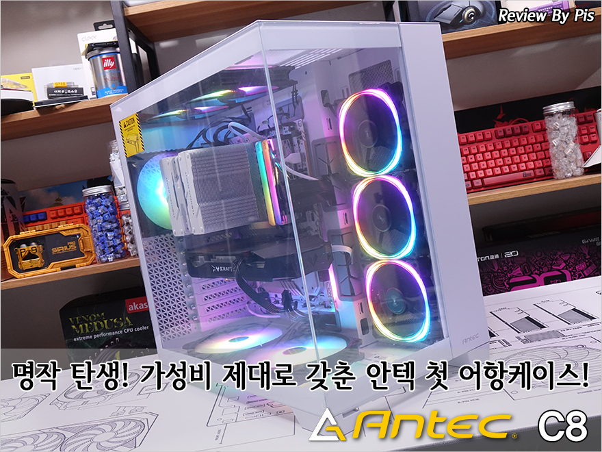 Antec(안텍)의 첫 파노라마-뷰 PC케이스이자 속칭 어항케이스로 새로운 시리즈 Constellation(콘스텔레이션) 라인업으로 선보인 첫 번째 모델 C8은 시작에서 언급했듯이 국내시장에도 출시하자마자 1차 물량이 완판 될 정도로 큰 인기를 얻고 있습니다. 가장 큰 이유는 한마디로 가성비죠. C8 케이스는 국내에서 배송비 포함 약 13만 원대로 판매되고 있는데, C8이 가지고 있는 케이스 사양과 규격 지원 모두 조건을 따져도 이 가격으로 어항케이스를 만나보기란 쉽지 않습니다. 이는 국내뿐만 아니라 해외 시장에서도 마찬가지죠. 한마디로 Antec이 첫 어항케이스 제품부터 예전의 PC케이스 명성을 되찾기 위해 이를 갈고 만들었다 느낄 수 있는 제품입니다. 물론, 기본 제공되는 팬이 없어서 아쉽다 생각하는 소비자가 있을 수 있지만, 어항케이스는 자신만의 스타일로 본체 내부를 튜닝하고 그걸 전면과 측면 강화유리를 통해 파노라마-뷰처럼 감상하는 목적이 있기 때문에 기본 팬 제공은 사실 어항케이스에서 큰 의미가 없습니다. 오히려 C8처럼 가장 기본이 되는 어항케이스 조건만 최대한 살려서 갖추고 꾸미는걸 소비자취향에 맡기는 게 이롭다 할 수 있죠. 또한, 어항케이스 부피에서도 C8은 큰 편에 속하기 때문에 내부 공간도 넓고, 막강한 쿨링시스템을 갖출 수 있게 폭넓은 규격을 지원해주고 있습니다. 그리고, 상단/측면 풀-메쉬 디자인이라든지 팬 브라켓, 에어 덕트 파티션 등 곳곳에 신경을 많이 썼다라는것도 느낄 수 있어서, 현재까지는 가장 가성비 어항케이스이자 오랜만에 Antec의 명작 케이스가 나왔다고 생각합니다. 그럼, 이상으로 마치겠습니다.