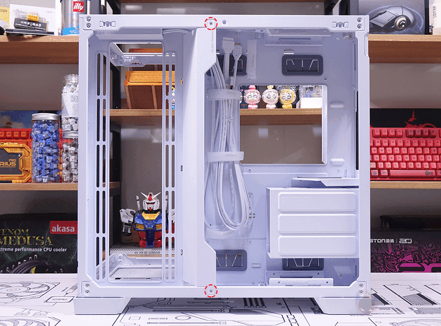 C8 케이스에는 기본 제공되는 팬이 없기 때문에, 최종적으로 팬까지 사용자가 선택해서 장착해줘야 합니다. 측면과 상단, 하단, 후면까지 팬을 모두 장착하면 막강한 쿨링효과를 누릴 수 있으며, RGB 팬을 사용한다면 조립 후 화려한 시각효과를 전면과 측면 강화유리 패널을 통해 외부에서도 감상할 수 있죠. 일반적으로 이런 파노라마-뷰 시각의 어항케이스는 대각선 방향이나 측면에서 감상할 때 가장 효과가 크죠.