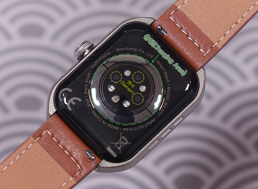 그리고, 시계 왼쪽 측면에는 블루투스 통화시 사용되는 스피커(Speaker)가 적용되어 있으며, 오른쪽 측면에는 크라운 디자인의 다이얼 버튼이 적용되어 있으며, 버튼 위쪽으로는 역시 블루투스 통화시 사용되는 마이크가 적용되어 있습니다. 뒤에서 확인하겠지만, 다이얼버튼은 다른 제품들과 마찬가지로 돌리면서 메뉴나 화면 이동을 할 수 있고, 누르는 버튼 역할도 함께 가지고 있습니다. 그리고, 시계 후면에는 S1 Pro와 마찬가지로 표면 유광처리로 방수가 되도록 했으며, 가운데 볼록한 부분의 테두리부분은 전용 충전기와 접촉되는 충전영역이며, 가운데 중심부에는 센서들이 적용되어 있죠. 참고로 심박수 측정 등을 위한 센서는 적용되어 있지만, GPS는 미적용입니다.