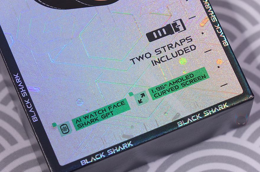 제품박스부터 살펴보면, 스마트워치 제품이기때문에 다른 제품들처럼 긴 박스형태를 가지고 있습니다. 그리고, 박스전체 비닐밀봉처리까지 되어있어서 좀 더 판매제품에 신뢰를 가질 수 있으며, 전반적으로 박스 표면에 빛에 따라 색상이 바뀌는 홀로그램형식으로 처리되어 있죠. 박스 전면에는 모델명과 함께 제품 이미지도 담고 있어서 시계 디자인을 미리 확인할 수 있으며, 아래에 2가지 스트랩(Straps)과 워치페이스, Shark GPT, 화면크기를 주요 특징으로 표기해놨습니다. 물론, 박스 후면에는 이외에도 추가적으로 배터리 사용시간, 100가지이상의 운동모드, 블루투스 전화통화, IP68등급의 방수방진을 주요 특징으로 표기해놨죠.