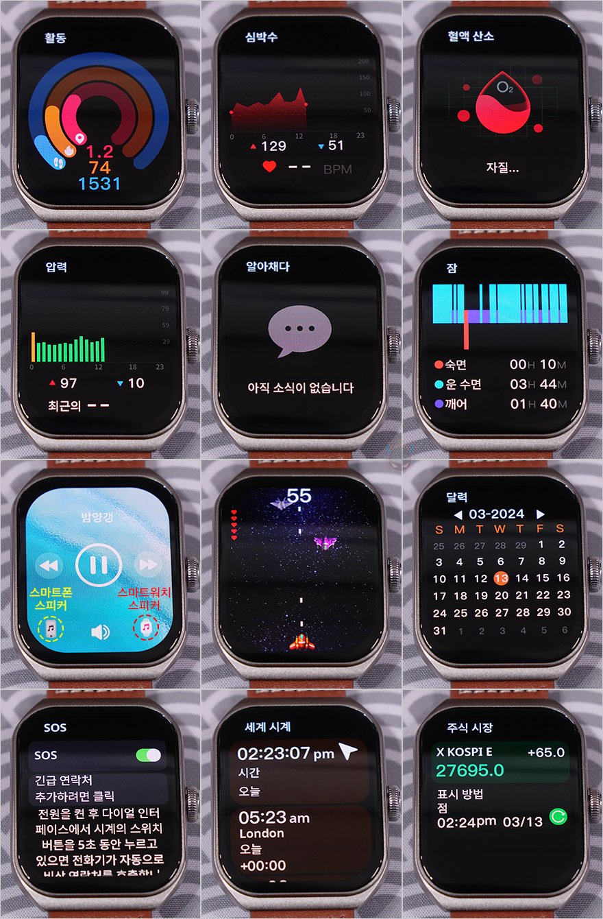 이밖에 블랙샤크 GT3 스마트워치에 탑재된 부가기능들 살펴보면, 활동량이나 심박수 같은경우에는 24시간 모니터링이 가능하고, SpO2(혈중산소포화도) 같은경우에는 S1 Pro와 마찬가지로 실시간 모니터링을 계속 지원하지 않고 수동적으로 사용자가 측정해야합니다. 스트레스나 메시지 알림, 수면 같은경우에는 24시간 모니터링이 가능하고, 음악(MUSIC) 재생 같은경우에도 스피커가 탑재되어 있어서, 스마트폰 스피커로 청취할지, GT3 스마트워치의 스피커로 청취할지 사용자가 선택할 수 있습니다. 또한, 대화면을 가지고 있는만큼 게임도 내장하고 있는데, 갤러그형태의 게임으로 터치방식으로 조작하며, 달력 기능도 있어서 큰 화면에서 날짜 보기가 편합니다. 그리고, 긴급상황이 저장해둔 연락처로 연락해주는 SOS 기능도 있으며, 나라별 세계 시계 기능도 사용자가 설정해 확인할 수 있고, 주식을 하고 있다면 주식현황도 확인할 수 있죠. 다만, 주식기능 같은경우에는 영문으로만 검색하고 추가할 수 있어서 한국주식은 달러단위로 확인할 수 있습니다.