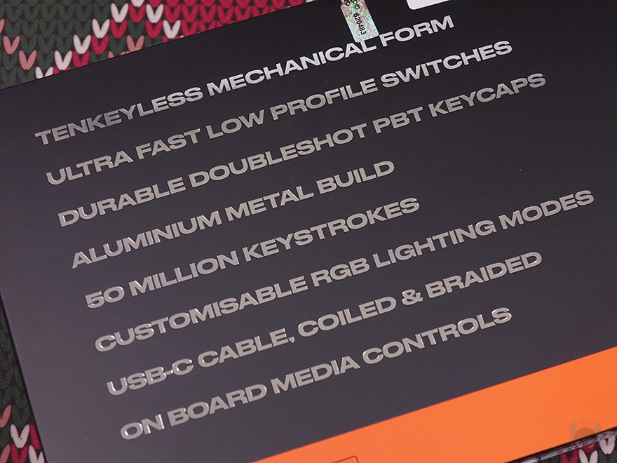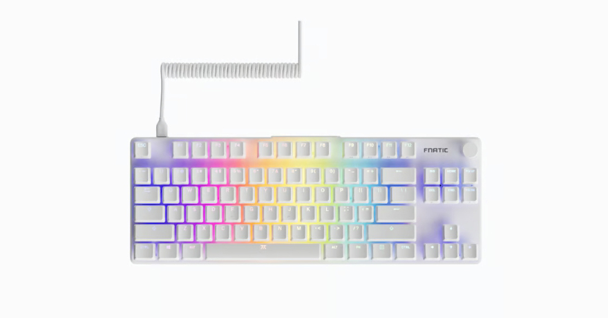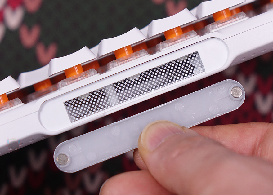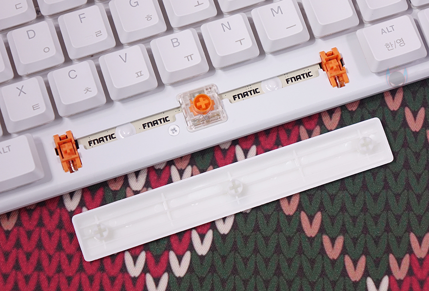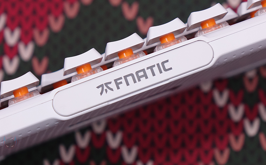 키보드 전면 한쪽에는 함께 제공되는 분리형 USB 전원케이블과 연결되는 USB 타입C 포트가 배치되어 있으며, 중앙 부분에는 Fnatic 로고가 새겨져 있는데, 예전부터 프나틱은 키보드 로고 부분에 커스텀으로 사용자가 변경할 수 있게 분리형으로 적용했죠. 이번 제품 역시 자석방식으로 로고 부분이 분리가 가능합니다. 그래서, 언제든지 사용자가 커스텀 디자인으로 변경할 수 있고, 키 스위치의 RGB 라이트닝 효과와 동일하게 작동되도록 로고 위치 내부에도 LED가 적용되어 있죠.