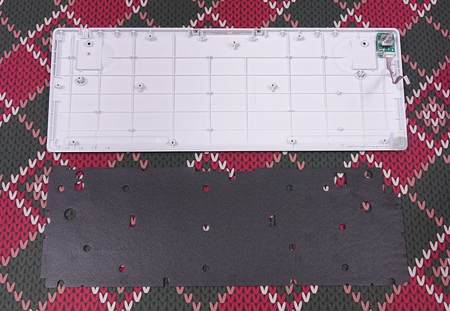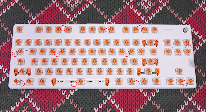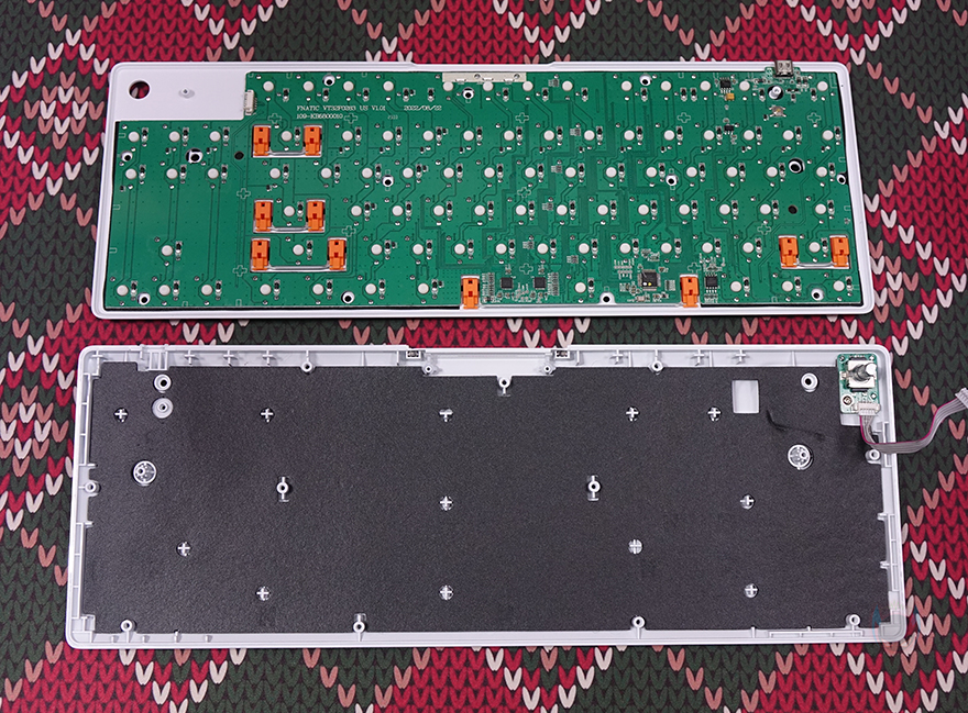 프나틱 스트릭80 LP 기계식 키보드는 키캡과 노브를 모두 빼내면, 화이트 색상의 알루미늄 메탈 상판에 고정된 나사들을 확인할 수 있는데, 위치한 나사들과 후면 받침대 안쪽에 보이는 나사까지 풀면, 쉽게 키보드 분해가 가능합니다. 스트릭80 LP 키보드를 분해해서 잠깐 살펴보면, 앞서 언급한 전면 로고 부분의 LED 효과를 볼 수 있게 내부에 LED가 적용된 것을 직접 확인할 수 있으며, MCU는 앞서 스펙사양에 표기된 것처럼 VEGA사 칩셋이 적용되었으며, 스위치와 PCB기판 분리는 안되지만, 테두리 부분에서 두 사이에 소음을 줄이도록 필름이 적용된 것을 간접적으로 확인할 수 있고, 키보드 케이스 하판 내부에는 흡음재가 적용된 것도 확인할 수 있습니다.