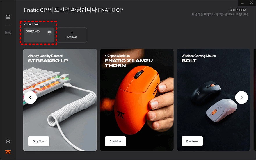끝으로, 프나틱(Fnatic)은 공용 소프트웨어 OP를 지원하는데, 스트릭80 LP 역시 이 프로그램을 사용할 수 있습니다. 프나틱 홈페이지에서 OP 프로그램을 다운로드하여 설치해 실행해 보면, 메인화면에서 인식된 스트릭80 LP 키보드 항목을 확인할 수 있죠. 메뉴를 크게 프로파일과 라이트닝, 키 설정 3가지이며, 프로파일은 4개를 지원하며, 키보드 이미지 아래 디바이스정보를 누르면 키보드 펌웨어 버전도 확인할 수 있습니다. 그리고, 라이트닝 설정에서는 앞서 확인한 RGB 모드 외에 Off까지 프로그램에서 설정할 수 있죠. 물론, 각 모드별로 더 상세한 설정을 하려면 OP 프로그램을 사용해야 합니다. 그리고, 키 설정은 리맵핑을 할 수 있고, 프로그램 설정에선 언어설정과 프로그램 자동실행 On/Off를 선택할 수 있습니다.