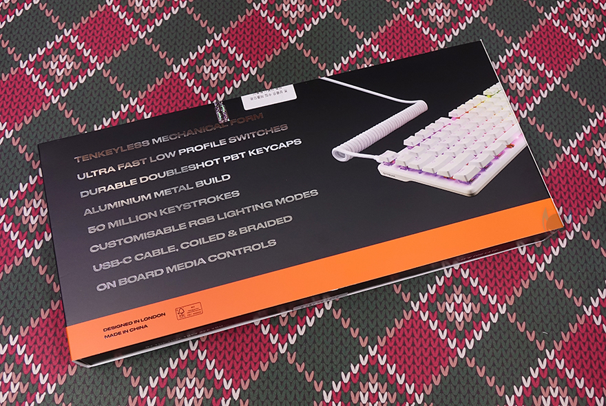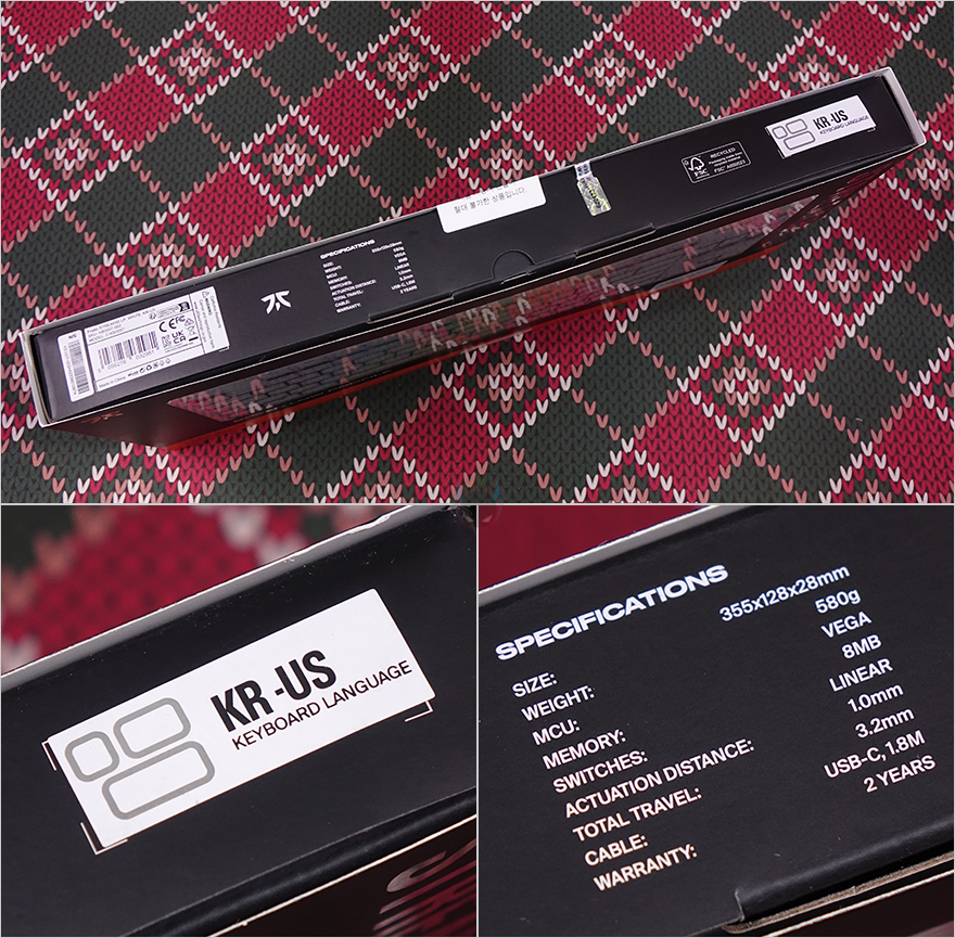 패키지 측면에는 속박스 측면을 볼 수 있는데, 한글 자판 레이아웃 표기와 제품의 기본 사양 표기를 확인할 수 있습니다. 사양 표기에는 키보드 크기부터 무게, MCU, 온보드 메모리, 스위치 등 핵심부분을 표기해 놨으며, 오리지널 동봉씰과 국내 정발 제품으로 정식수입사의 동봉씰까지 이중으로 부착된 것도 확인할 수 있죠. 커버를 벗기고, 속박스를 열어보면, 프나틱은 예전부터 키보드 포장에 종지 포장재를 사용했죠. 프나틱이 유럽 브랜드인 만큼 친환경정책으로 예전부터 적용했습니다. 그리고, 키보드와 케이블을 제외하면 제품설명서나 퀵-가이드 같은 구성품이 없는데, 이 역시 친환경정책으로 홈페이지에서 볼 수 있도록 속박스가 열리는 안쪽에 QR코드를 표기해 놨죠. 그래서, 전체 구성품은 방금 언급했듯이 스트릭80 LP 키보드와 분리형 USB 전원케이블만 있습니다.