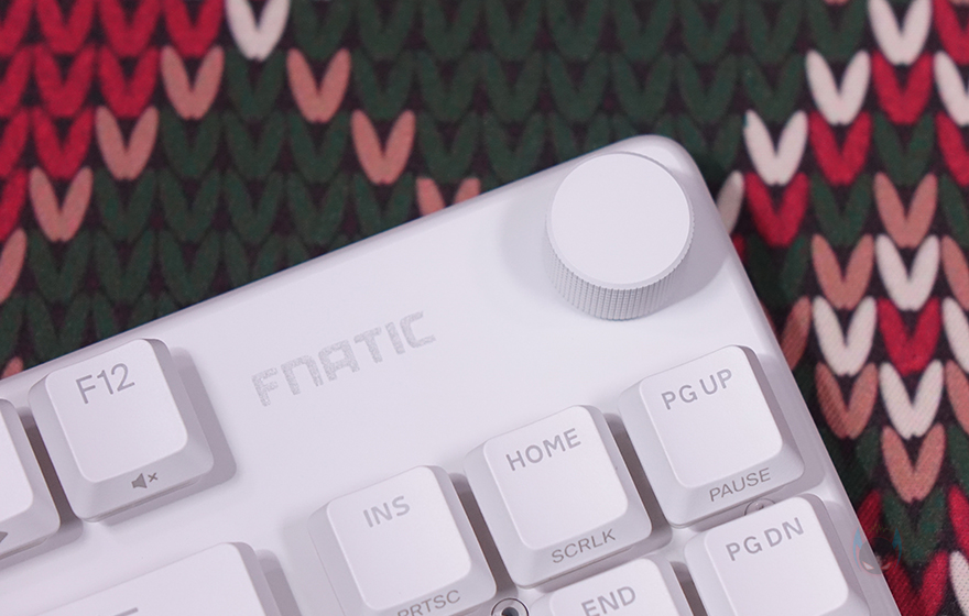 그럼, 본격적으로 프나틱(Fnatic)의 스트릭80 LP 기계식 키보드를 살펴보는데, 키보드 색상은 올-화이트이며, 앞서 패키지에서 잠깐 언급했듯이 키보드 배열은 텐키리스(Tenkeyless)입니다. 맨 오른쪽에 숫자키패드가 빠진 전형적인 87 키에서 맨 윗부분에 배치되는 특수키 3개까지 빠진 84 키 배열이죠. 그리고, 특수키 3개가 빠진 맨 윗부분 자리에는 요즘 키보드 트렌드 중 하나인 노브(Knob) 컨트롤러를 적용했습니다. 물론, 노브는 볼륨조절 및 음소거 기능을 가졌죠. 그리고, 키보드 무게는 스펙상에 근접하는 약 580g을 가졌습니다.
