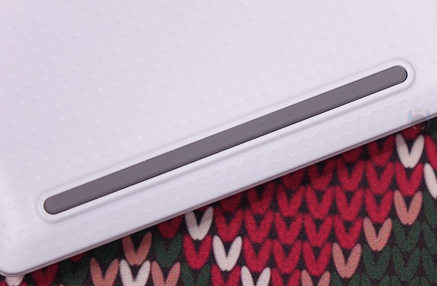 키보드 밑바닥부분에는 가까이에서 보면 표면에 일정 패턴 디자인을 적용했으며, 앞부분에는 양쪽으로 높낮이 받침대가 적용되어 있는데, 앞방향으로 접었다 펼치는 방식이 아닌 옆으로 접었다 펼치는 방식으로 나름 차별성을 주었습니다. 물론, 받침대 부분에는 고무패드가 적용되어 있으며, 밑바닥 아랫부분에도 길게 패드가 부착되어 있죠. 그리고, 키보드 측면에서 보면 로우-프로파일 스위치 콘셉트 키보드답게 높이가 낮은 것을 확인할 수 있는 동시에 낮은 높이임에도 다른 기계식 키보드처럼 타이핑에 최적화라 불리는 스텝-스컬처 2 단계배열을 적용하고 있습니다. 물론, 높낮이 받침대가 있기 때문에 너무 낮으면 높여서 사용할 수 있죠.