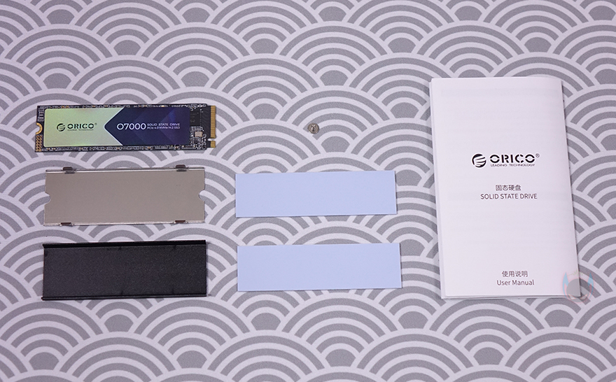 박스를 열어서, 포장을 확인해보면 투명-캡 방식으로 제품 틀에 맞춘 포장으로 흔들리지 않게 처리되어 있습니다. 제품구성에는 O7000 SSD, 방열판(Heatsink), 써멀패드(Thermalpad), 장착에 필요한 나사(Screw), 제품설명서로 이루어져 있죠. 눈길을 끄는건 히트싱크와 써멀패드를 기본 제공해준다라는 점인데, 일반적으로 요즘 NVMe SSD를 구입하면 SSD만 들어있는 경우가 많기때문입니다.