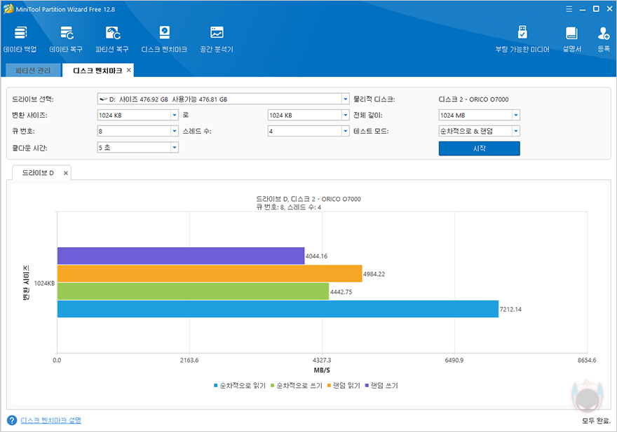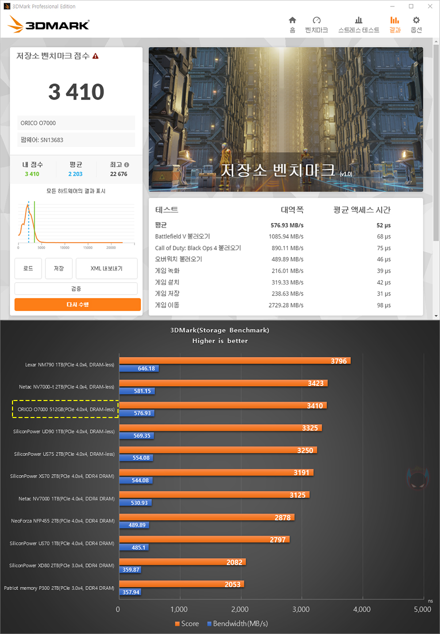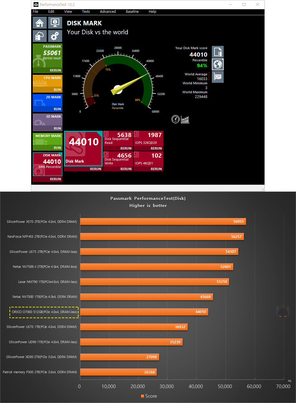이번에 추가적으로 다른 벤치마크 프로그램들을 통해서 좀더 O7000 SSD의 성능을 확인해보는데, ATTO Disk Benchmark, EaseUS DiskMark, MiniTool Partition Wizard 디스크 벤치마크를 통해서 읽기/쓰기 속도를 확인해보면, 스펙상의 속도보다는 전반적으로 읽기속도가 낮게 측정되었지만, 쓰기속도는 스펙상의 속도보다 높게 측정되었습니다. 그리고, Passmark PerformanceTest의 디스크 벤치마크와 3DMark의 디스크 벤치마크를 통해서 다른 NVMe SSD 제품들과 성능 비교를 해보면, 디램리스 SSD이지만, 용량대비 성느을 고려해보면 크게 떨어지는 성능이 아니라서 PCIe 4.0x4 규격이라는 점에서 가격대비 나름 만족스러운 결과라 할 수 있습니다.