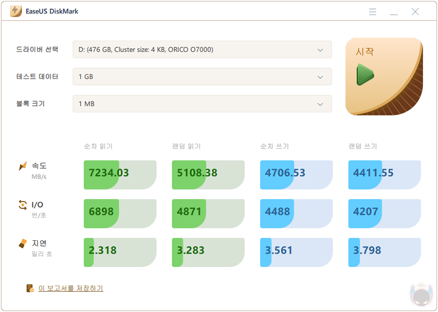 그럼, 이제 오리코(ORICO) O7000 SSD의 성능을 확인해보는데, 일단, O7000 SSD 같은경우 용량은 512GB, 1TB, 2TB, 4TB 4가지로 출시되었으며, 500GB 같은경우에는 스펙상으로 읽기속도는 나머지 용량 모델과 동일하지만, 쓰기속도는 절반수준으로 낮습니다. 이는 다른 저가형 SSD 제품들의 동급용량에서도 흔히 볼 수 있는 사양이기도 합니다. 그래서, 일반적으로 저가형 NVMe SSD을 구입할 때 쓰기속도까지 생각한다면 1TB용량부터 구매하는 소비자들도 있죠. 일단, 기본적인 제품정보 확인과 스펙상의 읽기/쓰기 속도 확인을 위해 CrystalDiskInfo와 CrystalDiskMark를 각각 실행해보면, CrystalDiskInfo를 통해 PCIe 4.0x4 레인 규격인것을 확인할 수 있고, DRAM이 없기때문에 쓰기속도저하방지를 위한 VolatileWriteCache 기술이 적용된 것을 확인할 수 있습니다. 그리고, 읽기와 쓰기속도는 순차와 랜덤접근 모두 스펙사양보다 좀 더 높게 측정된 것을 확인할 수 있죠.