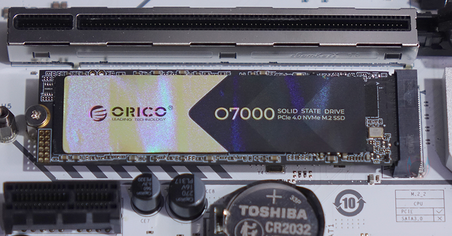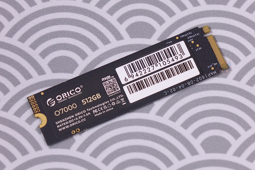 그럼, 본격적으로 오리코(ORICO)의 O7000 SSD를 살펴보는데, 사이즈는 가장 보편적으로 많이 사용되는 2280 사이즈이며, 전면에는 각도에 따라 반사빛에 색상이 다르게 보이느 홀로그램 같은 라벨스티커를 부착해놨습니다. 그리고, 후면에는 그냥 PCB기판에 용량 표기의 스티커만 부착되어 있죠. 쉽게 말해, 단면 SSD입니다.