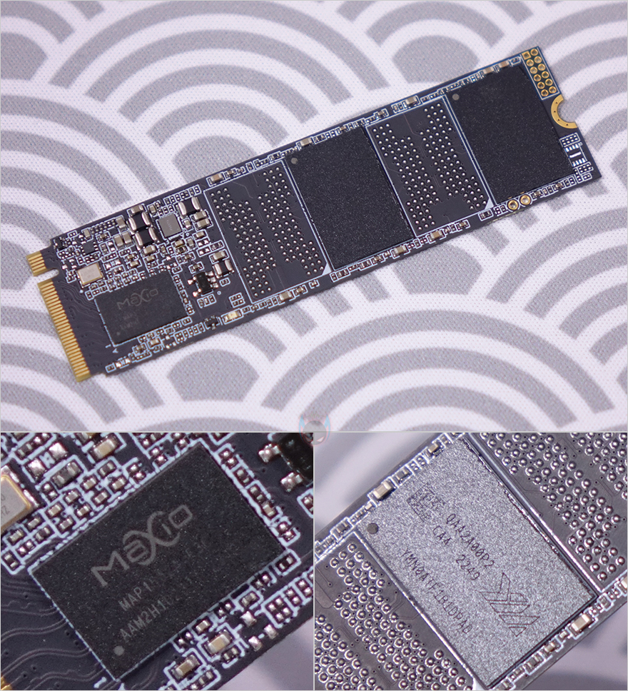 전면에 부착된 라벨스티커를 제거해서 PCB 기판에 적용된 컨트롤러 칩셋과 NAND 플래시를 확인해보면, 현재 저가형 NVMe SSD 제품에서 가장 많이 볼 수 있는 Maxio 컨트롤러 칩셋과 YTMC 3D NAND 플래시가 적용된 것을 확인할 수 있습니다. 물론, 저가형에 속하기때문에 DRAM은 적용되어 있지않습니다.