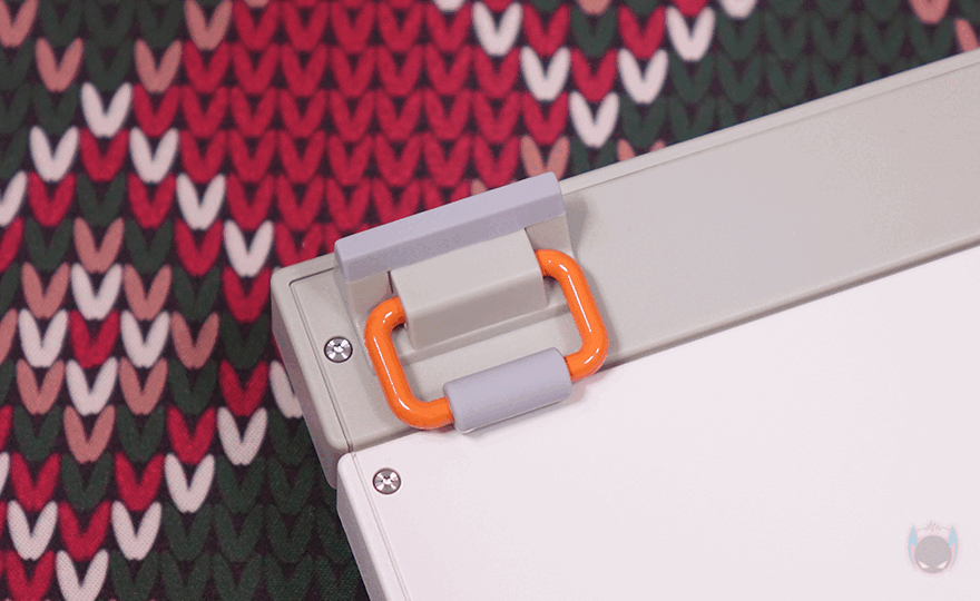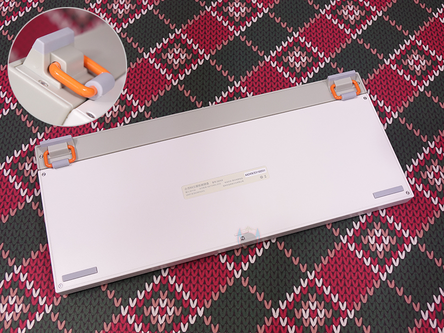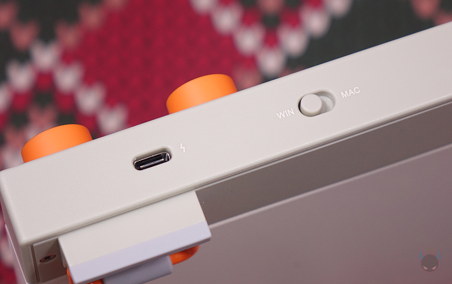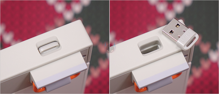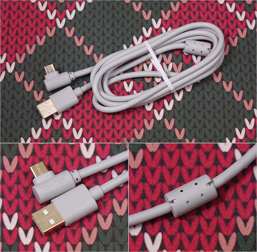그리고, 키보드측면 한쪽에는 BLOCK 98 모델명을 새겨놨으며, 키보드 전면에는 노브 위치쪽에 USB 전원케이블과 연결되는 USB Type-C 포트와 방금 언급했던 윈도우(Win)와 맥(Mac) OS 레이아웃 스위치가 배치되어 있습니다. 또한, 반대편인 ESC 키 위치에 전면에는 무선 2.4G 사용 시 이용되는 수신기(recevier)가 수납되어 있죠. 물론, 수신기는 동전크기정도로 작은 흔히 말하는 나노 리시버입니다. 이밖에도 키보드 밑바닥 부분에는 모서리 부근으로 미끄럼방지 패드가 기본 부착되어 있으며, 앞부분에는 받침대도 적용되었는데, Lofree(로프리)답게 일반적인 받침대 디자인이 아닌 차별화를 두고 있습니다. 그리고, 키보드 측면에서 보면 타이핑에 최적화라 불리는 스텝-스컬처 2(step sculpture 2) 단계 배열을 갖추고 있으며, 높낮이 조절이 가능하기 때문에 사용자가 선택해서 사용하면 됩니다. 끝으로, 유선시 사용되는 USB 케이블은 총 1.5m 길이에 USB Type-A to C 인터페이스를 가졌으며, 신호손실 최소화를 위해 금도금(gold plated) 처리와 노이즈 필터(Noise filter)가 적용되어 있습니다.