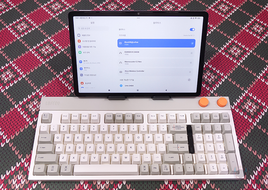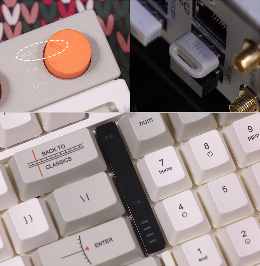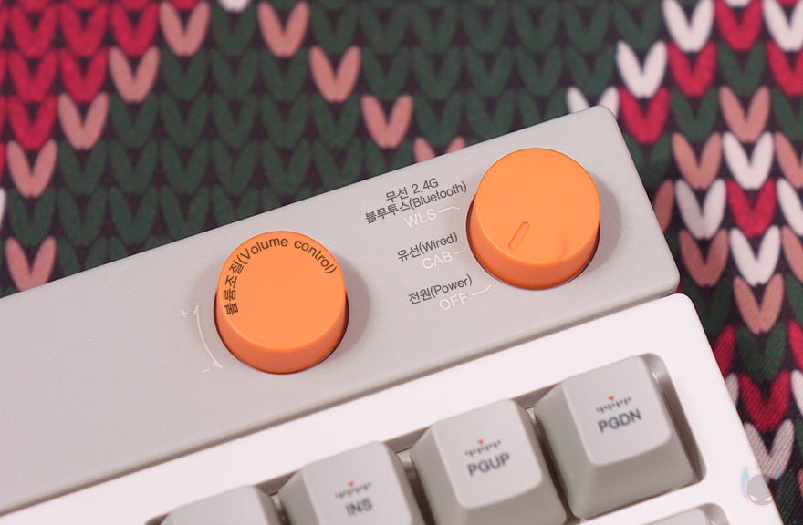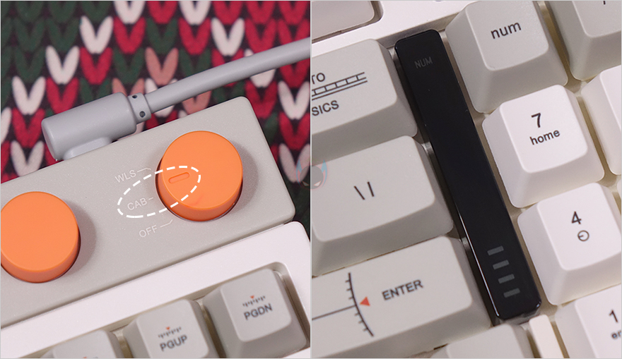 방금 언급했듯이 BLOCK 98 키보드는 98키98 키 배열로, 일반적인 풀-배열 키보드보다 크기는 줄이면서 최대한 풀-배열에 가깝게 채운 것이 98 키 배열인데, BLOCK 98도 그 특징을 그대로 담고 있죠. 일반적으로 숫자키패드 왼쪽 공간이 방향키와 9개의 특수키 자리인데, 그 자리를 최대한 줄였습니다. 그리고, 엔터(Enter) 키와의 사이에는 키보드 기능 활성화 유무와 배터리 잔량을 육안으로 쉽게 확인할 수 있게 패널 인디케이터(Panel Indicator)를 적용했습니다. 그리고, 숫자키패드 바로 위에는 특수키 4개를 배치해 놨으며, 그 바로 위에는 2개의 노브(Knob) 컨트롤러가 오렌지(Orange) 색상으로 포인트를 주고 있는데, 왼쪽 노브는 볼륨 조절(Volume control), 오른쪽 노브는 전원(Power) Off 및 연결모드 기능으로 CAB은 유선(wired) 모드, WLS는 무선(Wireless) 모드로 무선 2.4G와 블루투스(Bluetooth) 2가지 모드를 사용할 때 선택합니다. 그리고, 같은 위치에 맨 왼쪽에는 Lofree 로고(logo)를 새겨놨죠.