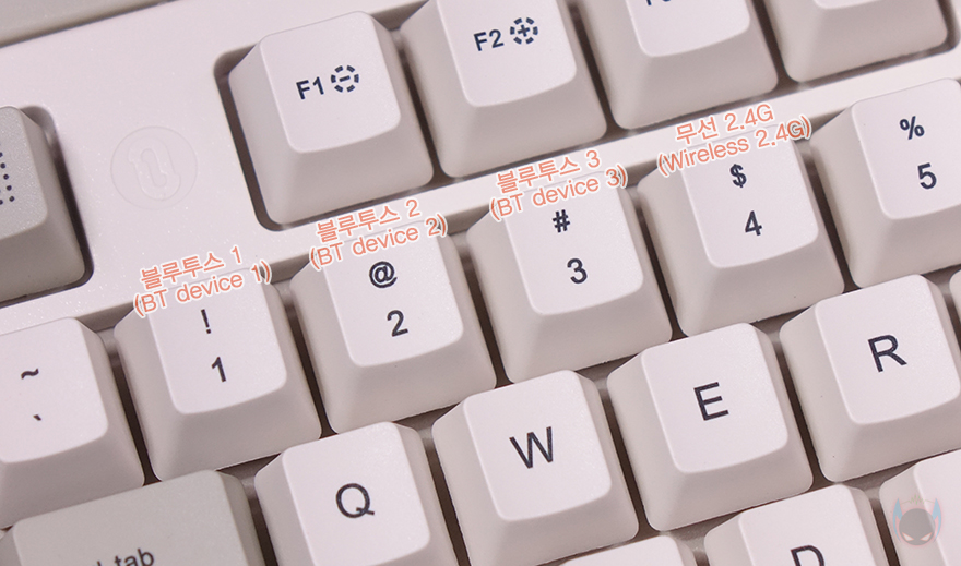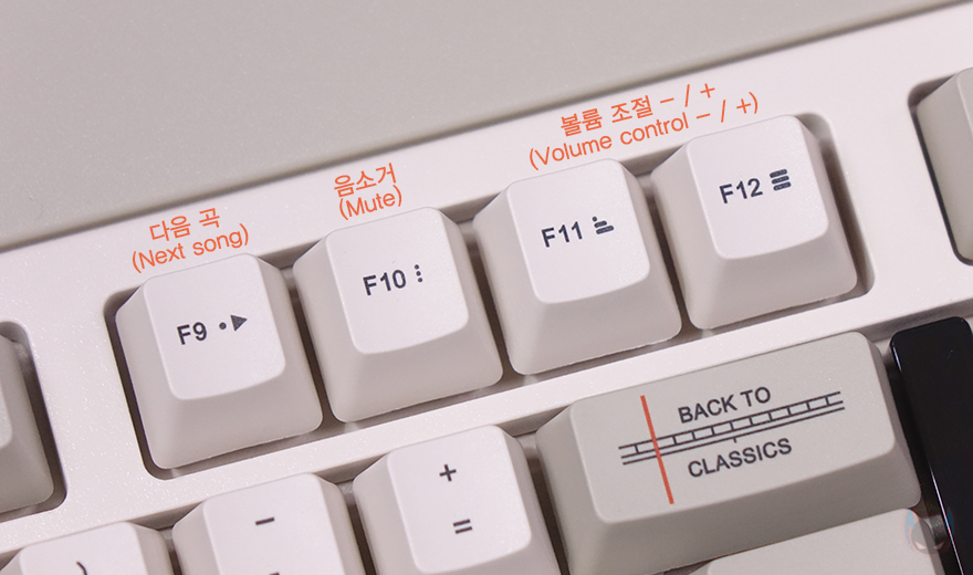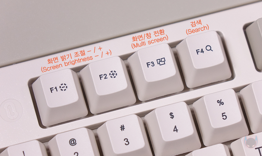 BLOCK 98 키보드 역시 Fn 키 조합으로 부가 기능을 지원하는데, 바로 뒤에서 확인하겠지만, 자판 레이아웃도 윈도우(Win)와 맥(Mac) 운영체제에 맞게 선택할 수 있습니다. 부가 기능에는 F1~F2키는 화면 밝기조절, F3키는 화면/창 전환, F4키는 검색, F5키는 스크린샷, F6키는 계산기, F7~F9키는 재생 컨트롤(Media play control), F10키는 음소거, F11~F12키는 볼륨조절 기능을 가졌습니다. 참고로, 맥(Mac) 레이아웃 사용할 때는 F5키 스크린샷과 F6키 계산기 기능이 작동되지 않습니다. 이외에도 숫자키 1~3까지는 블루투스 디바이스(Bluetooth device), 숫자키 4는 무선 2.4G 연결, 상하(▲▼) 방향키는 백라이트 밝기조절, 좌우(◀▶) 방향키는 백라이트 모드 전환 기능을 가졌습니다.