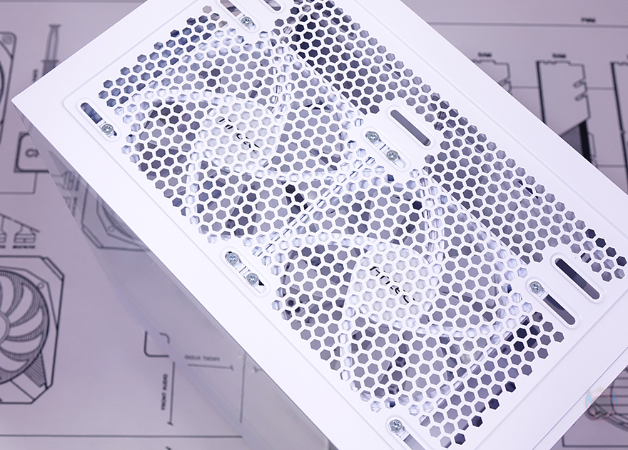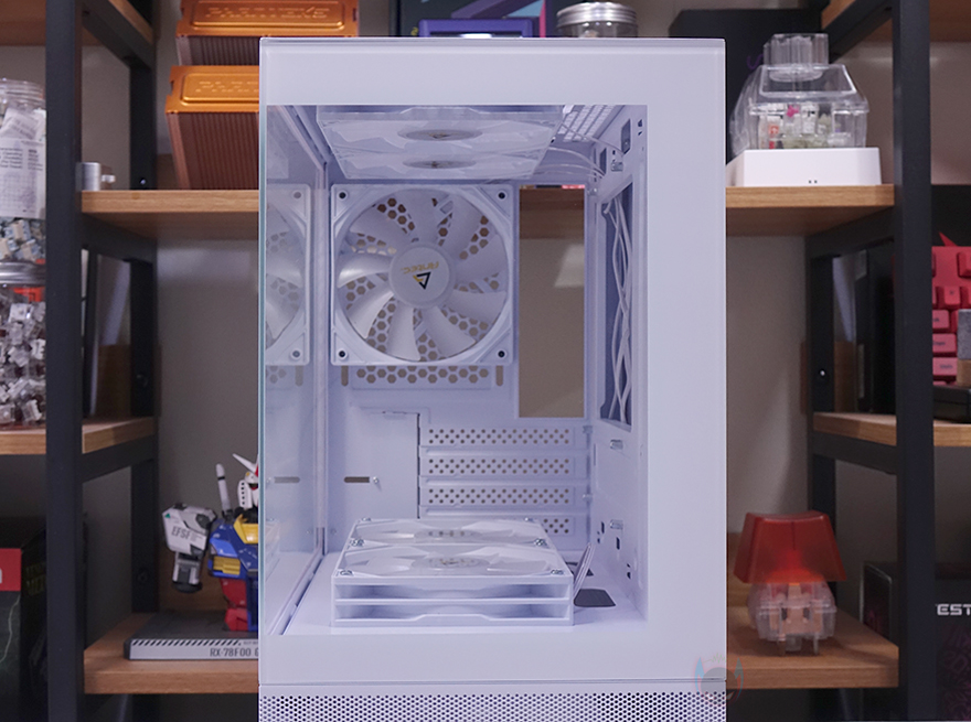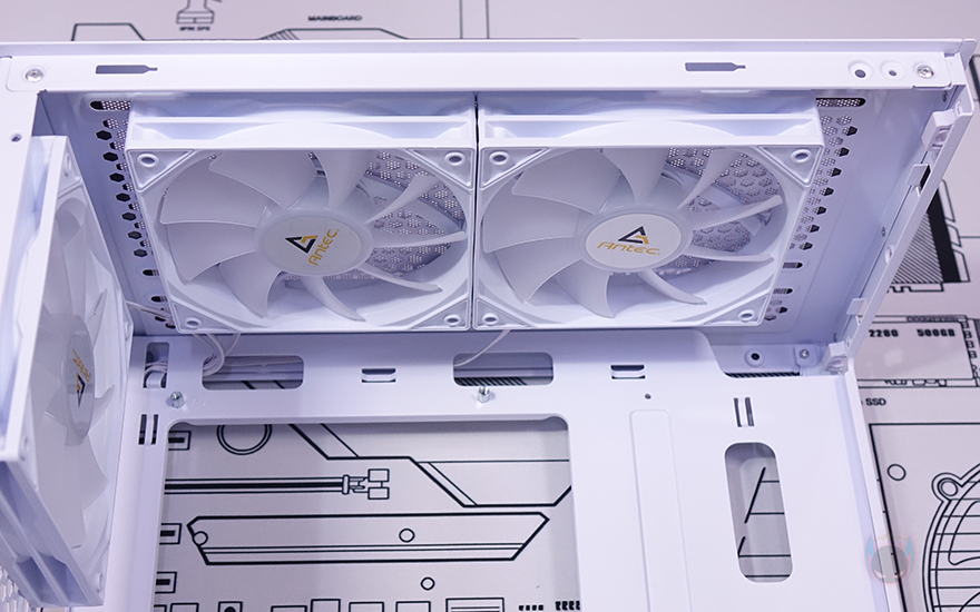 내부 상단에는 앞서 외부에서 잠깐 확인했던 상단 쿨링시스템의 120mm 팬 2개를 다시 확인할 수 있는데, 케이스 색상에 맞춰 화이트 색상이며, RGB 팬이기 때문에 팬 날개도 반투명으로 적용되어 있습니다. 내부 하단의 파워서플라이 커버 상단에도 하단 쿨링시스템으로 120mm 팬이 2개 기본 장착되어 있는데, 디자인은 상단과 동일하나 팬 날개가 반대인 리버스 팬을 적용하고 있죠. 쉽게 말해, 하단에서 외부 공기를 유입해 상단과 후면으로 공기가 배출되는 쿨링시스템입니다. 내부 후면 역시 120mm 팬이며 상단 팬과 동일합니다. 그리고, PCI 슬롯가이드는 모두 일회용이지만, 앞서 구성품에서 확인했듯이 재사용이 가능한 탈착용 2개가 제공되기 때문에 슬롯가이드 낭비는 없습니다.