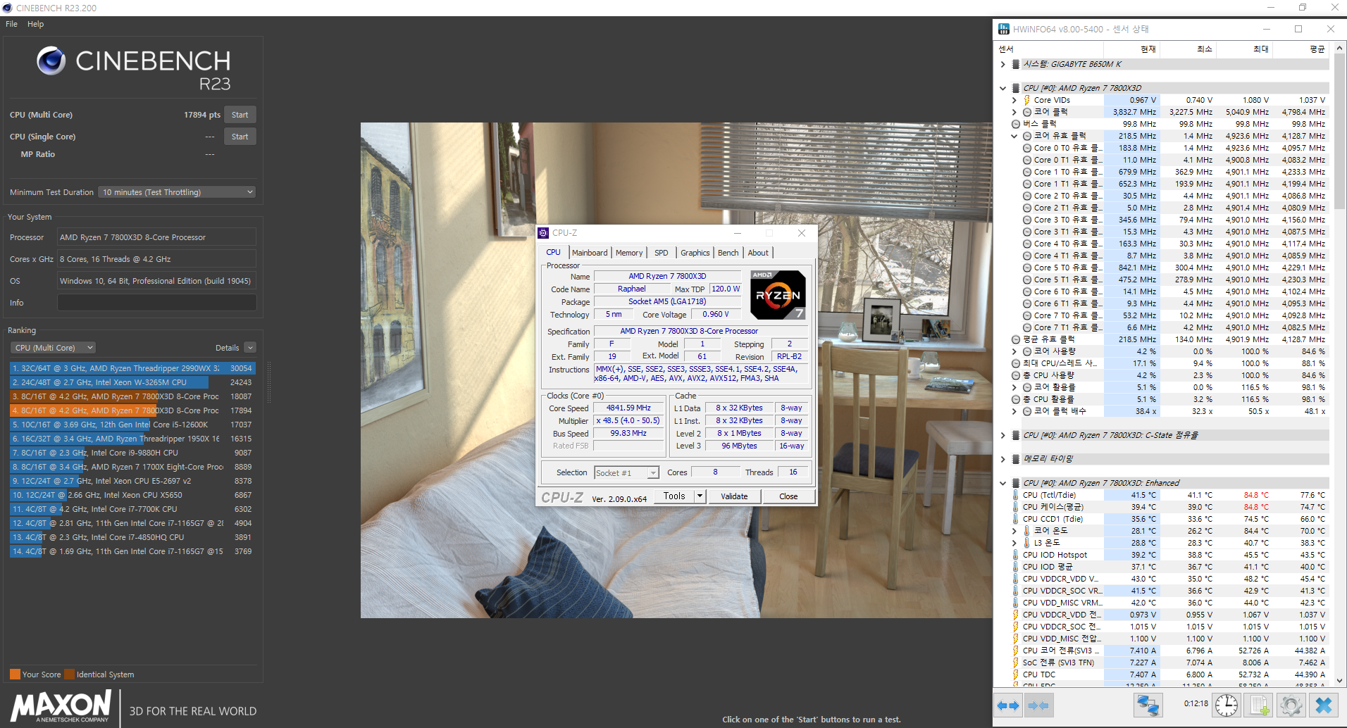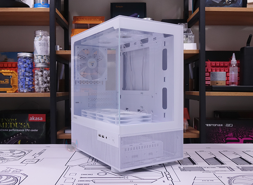 조립 후 시스템을 켜면 내부에 기본 장착된 5개의 팬 모두 RGB 팬으로 라이트닝효과를 바로 볼 수 있으며, 전면보다는 대각선 또는 측면에서 시각효과가 좋습니다. 그리고, LED On/Off 버튼을 사용하면 쉽게 RGB 효과를 On/Off 할 수 있죠. 쿨링시스템은 앞서 언급했듯이 케이스 아랫부분에 메쉬 디자인 에어홀을 통해 아래에서 공기가 유입되면서 내부 하단 팬을 거쳐 후면과 상단 팬으로 공기가 빠져나가는 구조입니다. 실제 인공 연기를 통해 흡입과 배출되는 구조를 보면 쉽게 이해가 됩니다. 또한, 팬이 장착되는 곳에 모두 기본 장착되어 제공되고 있어서 CPU쿨러만 받쳐준다면 일부 고성능의 CPU 시스템도 충분히 갖출 수 있죠. 실제로 현재 가장 인기 있는 CPU 중 하나인 AMD 라이젠 7 7800X3D 시스템으로도 충분히 소화가 가능한 미니타워였습니다.