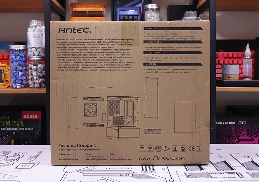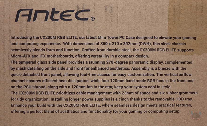 제품박스부터 살펴보면, 미니타워 케이스답게 박스자체도 아담한 사이즈를 가졌습니다. 그리고, 안텍의 다른 PC케이스들과 마찬가지로 전면에는 제품 디자인 이미지와 함께 모델명, 그리고 색상 구분 표기를 확인할 수 있는데, CX200M RGB Elite는 블랙과 화이트로 출시되었습니다. 또한, 반대쪽 측면에는 CX200M RGB Elite 제품 소개와 함께 주요 특징을 언급하고 있는데, 쿨링과 전/측면 강화유리에 따른 270도 파노라마 뷰, 케이블 정리 공간을 언급하고 있습니다. 그리고, 바로 아래에는 간략하게 케이스 구조 이미지도 담고 있으며, 박스 측면 한쪽에는 제품의 기본 사양 표기도 상세하게 표기하고 있어서 오프라인 시장에서 구입하더라도 충분히 제품 정보를 얻을 수 있죠.