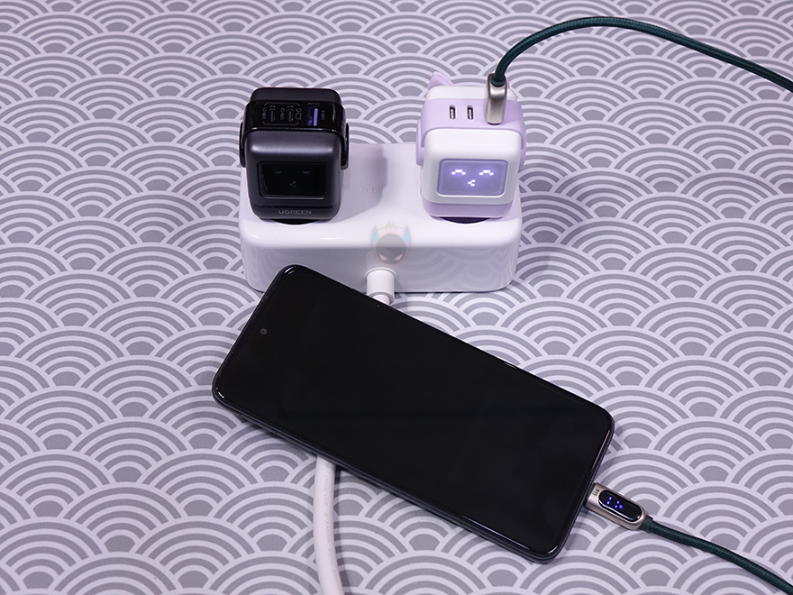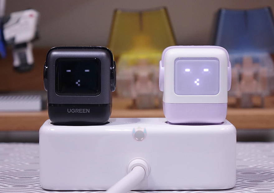 그럼, 직접 유그린(UGREEN) Nexode RG 65W 고속 충전기를 사용해 봐야겠죠?! 충전기를 콘센트에 장착하면 바로 전면에 배치된 LED 디스플레이에 눈/코 모양의 이모티콘(emoticon)이 켜집니다. 눈에 띄는 점은 블랙과 퍼플색상 제품에 따라 LED 디스플레이 배경색 차이가 있는데, 블랙색상 같은 경우에는 배경이 어둡기때문에 굳이 LED를 많이 밝게하지 않아도 뚜렷이 볼일정도의 밝기만 적용했으며, 반대로 퍼플색상 같은경우 배경색이 밝기 때문에 LED가 뚜렷이 보이도록 블랙색상의 LED보다 더 밝게 적용된 것을 확인할 수 있습니다. 세심한 부분까지 신경 쓴 거죠. 그리고, 이모티콘(emoticon) 같은 경우에도 대기상태와 충전상태 그리고 완충상태일 때 달라지는 것을 확인할 수 있습니다.