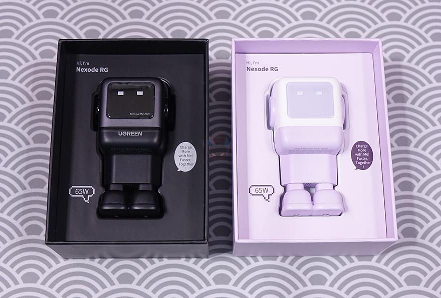 유그린(UGREEN) Nexode RG 65W 고속 충전기를 살펴보면, 일단 색상은 앞서 언급했듯이 블랙과 퍼플 2가지 색상으로 출시되었습니다. 정확히는 각 색상별로 투톤 컬러를 가지고 있는데, 블랙색상은 블랙과 그레이 계열로, 퍼플 색상은 퍼플와 화이트 계열로 적용되어 있습니다. 그리고, 한눈에 봐도 제품 디자인이 그동안 보던 일반적인 충전기와는 다르죠. 뒤에서 확인하겠지만, 전면에는 충전 상태에 따라서 쉽게 확인할 수 있는 LED 디스플레이가 배치되어 있는데, 이 부분을 통해 전체적인 디자인 감성이 로봇(Robot) 감성으로 느끼게 해 줍니다. 그리고, 두 제품 디자인에 약간의 차이도 있는데, 블랙색상 같은 경우에는 LED 디스플레이 아래에 UGREEN 로고(logo)를 새겨놨고, 측면에서 보면 마치 로봇 얼굴에 헤드셋을 착용한 형상의 디자인을 적용하고 잇는데, 블랙색상 제품은 유광처리를, 퍼플색상 제품은 무광으로 처리되어 있습니다.