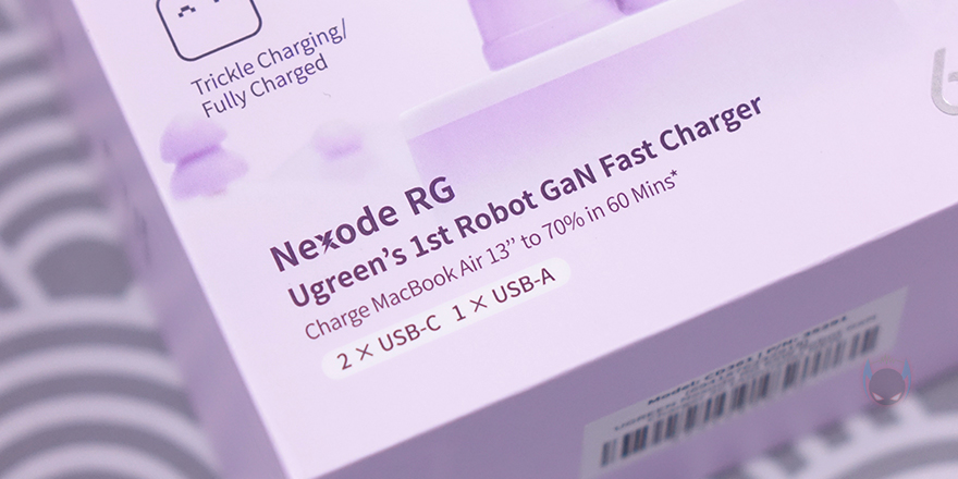 제품 패키지부터 살펴보면, 뒤에서 확인하겠지만, Nexode RG 65W 고속 충전기는 블랙과 퍼플 2가지 색상으로 출시되었습니다. 그래서, 제품 색상에 맞춰서 제품 패키지 박스도 그대로 적용하고 있죠. 또한, 제품 박스 전면에 담긴 제품의 이미지도 색상구분대로 담고 있는데, 제품 전면만 담은 이미지라 동일하다 생각할 수 있겠지만, 디자인에 약간의 차이점을 두고 있습니다. 그리고, 제품박스 색상과 제품 이미지는 다르지만, 박스에 담긴 정보들은 동일한데, 일단 제품 이미지 왼쪽에는 이제품의 핵심 중 하나인 충전상태를 보여주는 LED 디스플레이의 상태 표시를 간략하게 설명해 줍니다. 그리고, 아래에는 제품 이름과 포트 개수를 표기해 놨는데, Nexode RG의 RG 단어는 Robot GaN의 줄임말이죠. 그리고, 박스 한쪽 측면에는 제품의 주요 특징, 반대쪽 측면에는 포트별 충전속도를 표기해 놨습니다.