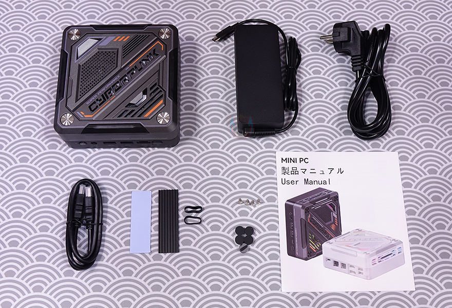겉표지에는 별다른 추가 정보는 없으며, 겉표지에서 속박스를 꺼내 열어보면, 외부 충격방지를 위한 스펀지 포장재와 함께, 내부에는 좌우로 미니PC 포장공간과 부속품이 들어있는 별도의 박스포장 공간으로 나뉘어 있습니다. 전체 제품 구성에는 AN3 미니 PC, 전원어댑터 및 전원 케이블, HDMI 케이블, SSD 방열판 및 써멀패드, 고무밴드, 커버 나사 및 받침 패드, 제품설명서로 이루어져 있는데, 이 기준은 No RAM, No Storage 옵션 기준이며, RAM와 Storage가 포함된 옵션으로 구매하면 커버 나사와 받침패드가 이미 적용된 상태일 수 있습니다. 제품 설명서에는 간략하제 명칭이랑 RAM, SSD 설치 설명이 담겨 있죠.