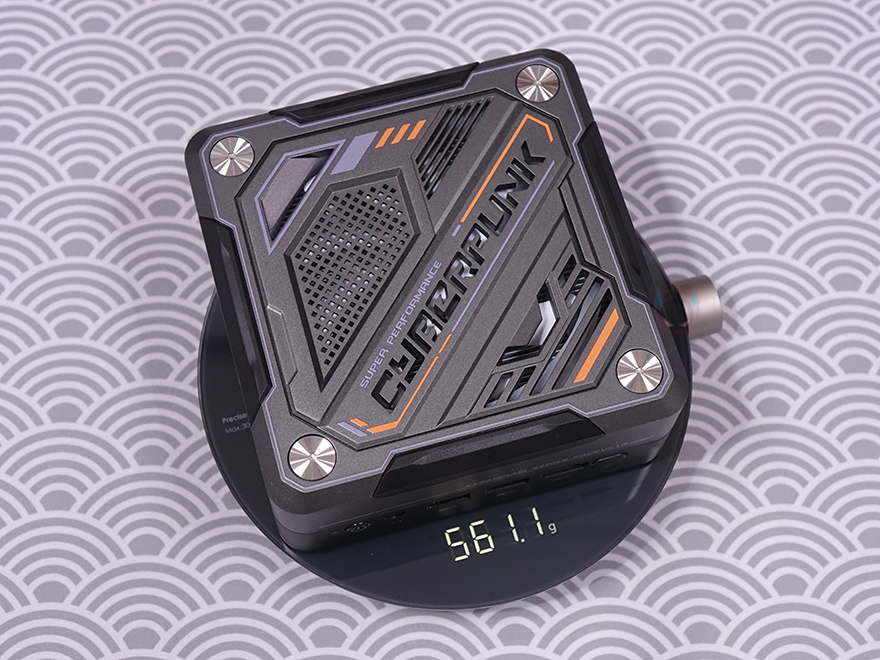 그럼, 본격적으로 CHATREEY AN3 미니PC(mini PC)를 살펴보는데, 색상은 전반적으로 블랙계열이며, 한눈에 봐도 게이밍(Gaming) 콘셉트다라는 걸 알 수 있죠. RAM와 SSD가 장착되지 않은 순수 본체상태에서 무게는 약 561g으로 미니 PC 답게 가볍습니다. 참고로, RAM와 SSD를 장착해도 무게는 640g이 되지 않습니다. 그리고, 본체 크기는 132x132x55mm입니다.