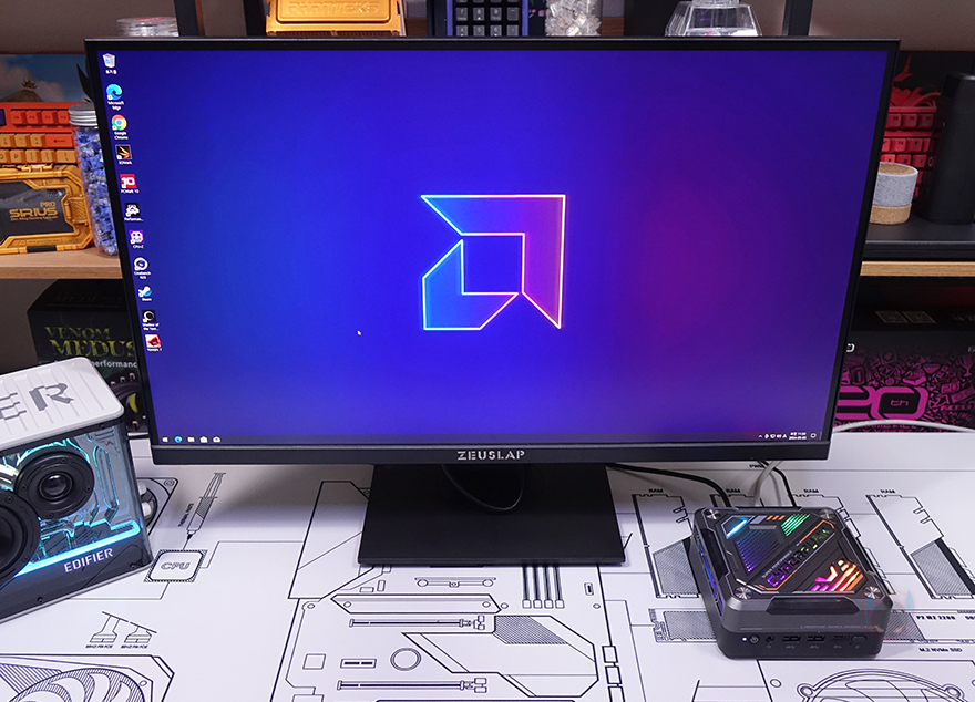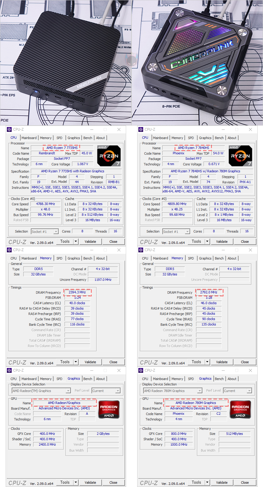이제, AN3 미니 PC의 성능을 확인해 보는데, AN3 미니 PC에는 앞서 언급했듯이 AMD 라이젠 CPU가 탑재되어 있습니다. 정확히는 라이젠 7 7840HS APU로 이미 미니 PC뿐만 아니라 UMPC에서도 많이 사용되고 있는 인기 CPU 중 하나죠. 그래서, 라이젠 7 7840HS APU와 가장 비교될만한 사양으로 바로 이전 세대인 라이젠 7 7735HS APU가 적용된 미니 PC를 선택했습니다. 두 CPU 모두 8 코어와 16 쓰레드 구조에 부스트클럭도 4.8 GHz로 비슷하죠. 또한, 메모리도 DDR5로 동일한데, 다만 CPU 세대에 따라 메모리 클럭작동은 4800 MHz과 5600 MHz으로 차이가 있으며, 또 하나 가장 큰 차이는 내장그래픽으로 라이젠 7 7735HS에는 라데온(Radeon) 680M이 탑재되었고, 라이젠 7 7840HS에는 후속인 라데온 780M이 탑재되었습니다.