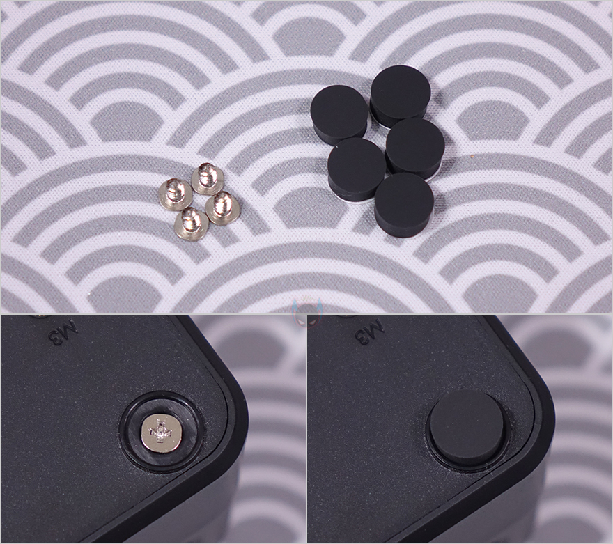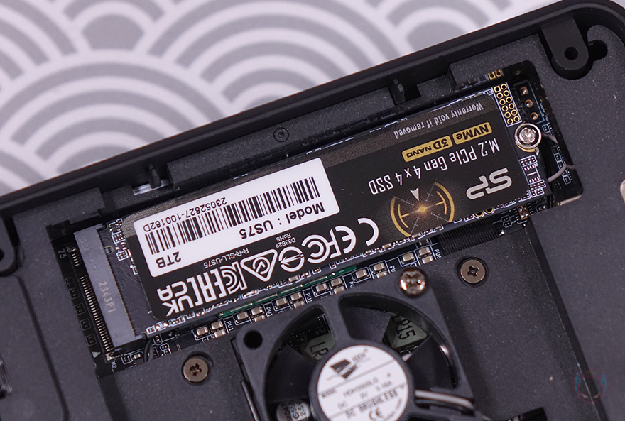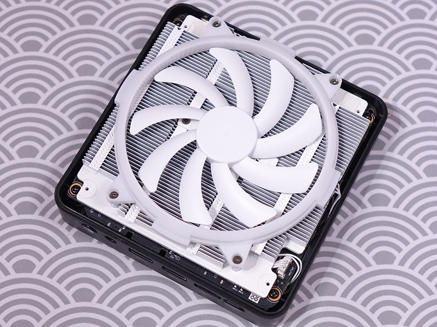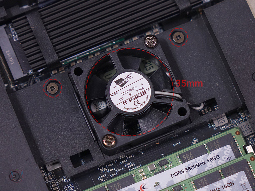 만약, 장착하는 NVMe SSD에 방열판(Heatsink)이 없다면, AN3에서 기본제공해 주는 방열판과 써멀패드(Thermalpad)를 사용하면 되고, 고정은 고무밴드로 해줍니다. 그리고, 중앙에 위치한 팬(Fan)은 35mm 팬으로 배기역할을 하는데, 양쪽에 고정된 나사를 풀면, 팬이 위치한 곳이 전원부에 해당하는 곳임을 확인할 수 있죠. 그래서, 상단에는 CPU 쿨링을 위한 팬 하단에는 전원부 쿨링을 위한 팬으로 AN3는 듀얼 팬(Dual Fan) 구성을 하고 있습니다. 그리고, No RAM, No Storage 옵션으로 구매해서 RAM과 SSD를 장착했다면, 다시 커버를 씌울 때는 제공되는 나사와 받침패드를 사용하면 되죠.