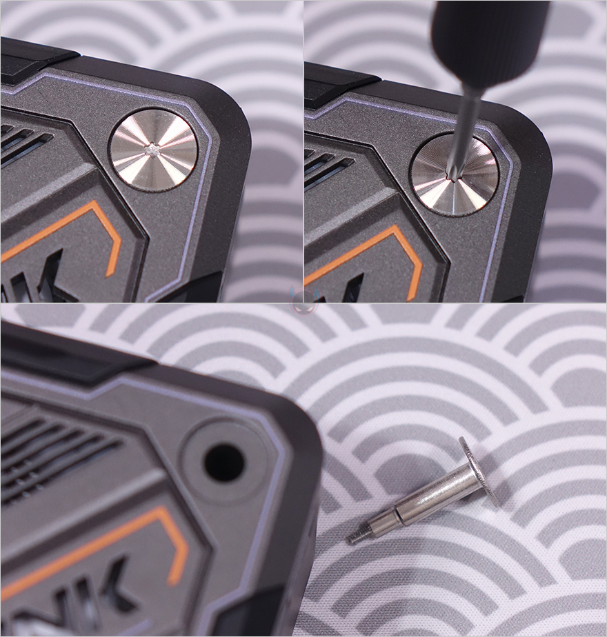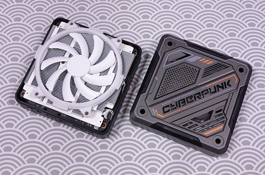 본체 상단부터 상세히 살펴보면, 상단은 게이밍(Gaming) 콘셉트를 가장 잘 보여주는 디자인으로 사이버펑크(CYBERPUNK) 문구를 새겨놨는데, 외부 공기가 유입되도록 에어홀처럼 처리했습니다. 그리고, 문구 기준으로 위/아래로도 각각 다른 디자인의 에어홀을 적용했죠. 그리고, 상단 모서리 부근에는 육각나사가 적용되어 있는데, 나사를 풀면 쉽게 상단 커버를 분리할 수 있고, 커버를 분리하면 내부에 상단 쿨링시스템으로 화이트(White) 색상의 방열판(Heatsink)과 팬(Fan)이 장착된 것을 확인할 수 있죠. 정확히는 이 부분 그러니깐 히트싱크 아래에 CPU가 장착되어 있습니다. 그리고, 팬 크기는 약 100mm로 뒤에서 확인하겠지만, RGB 팬이죠.