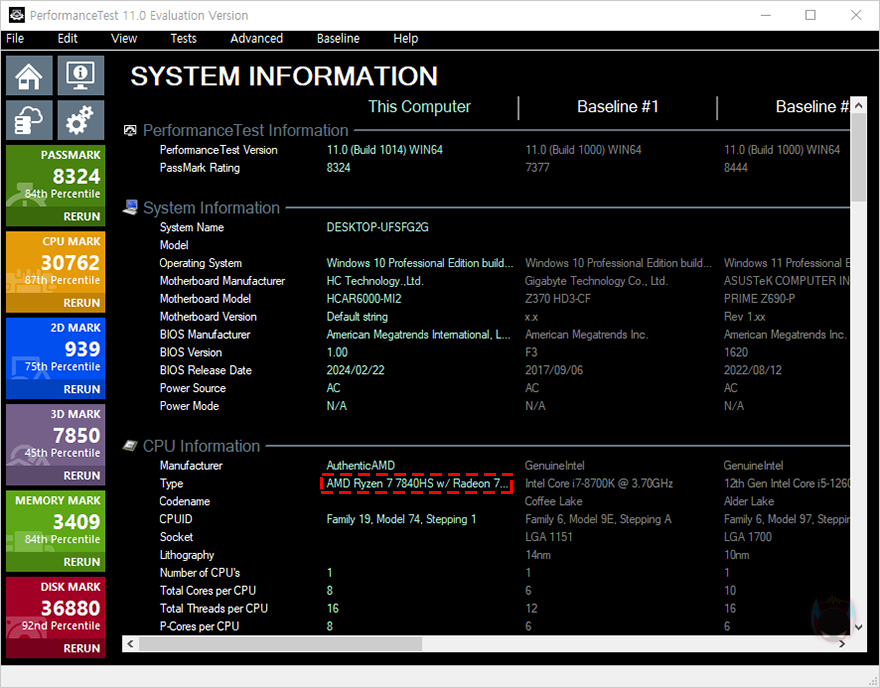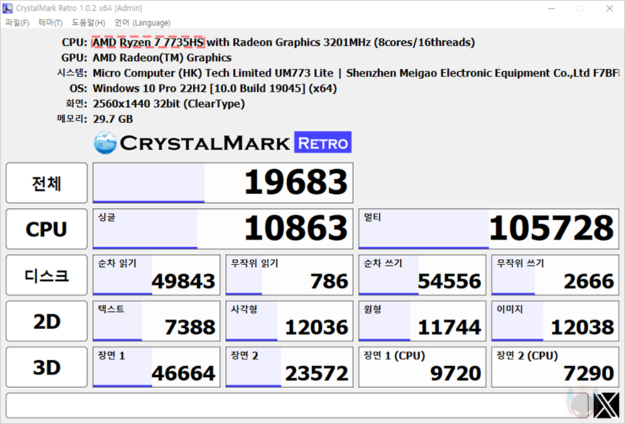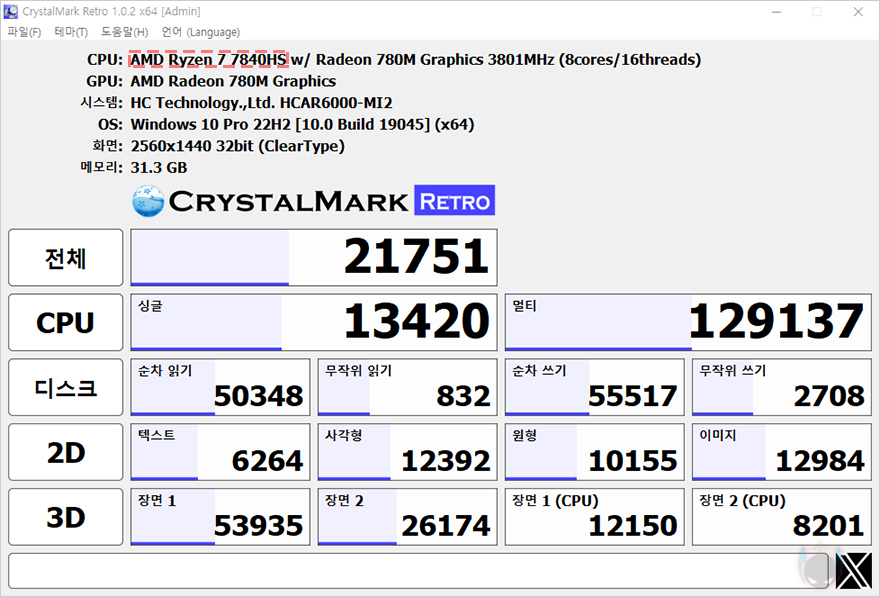 이번엔 전체 시스템 성능을 비교해 보는데, PCMark 10과 PerformanceTest, CrystalMark Retro 벤치마크 프로그램으로 실행 비교해 본 결과, 모두 라이젠 7 7840HS APU가 탑재된 AN3 미니 PC가 앞서는 것을 확인할 수 있습니다. CPU와 GPU뿐만 아니라 앞서 메모리 클럭에서도 기본 작동클럭 차이를 보이기 때문에, 종합적으로 시스템 성능에서도 앞서죠.