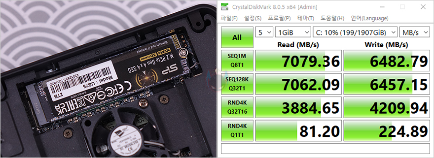 끝으로, AN3 미니 PC의 M.2 SSD 슬롯은 PCIe 4.0 규격을 지원합니다. 정확히는 PCIe 4.0x4 규격까지 지원하죠. 그래서, 장착된 NVMe SSD 역시 PCIe 4.0x4 규격으로 CrystalDiskMark를 통해 성능을 확인해 보면, PCIe 4.0x4 규격상 나오는 최대 읽기와 쓰기 속도대를 확인할 수 있습니다. 그리고, 전면에 USB 4.0 규격의 USB Type-C 포트가 배치된 것을 앞서 확인하면서 언급했는데, USB 4.0 지원의 외장 SSD를 사용하면 역시 외장 SSD로는 최고의 성능으로 사용할 수 있죠. 또한, 외장 모니터 연결로도 사용할 수 있습니다. 참고로, USB 4.0을 제대로 사용하려면 윈도우 11 운영체제를 사용해야 합니다.