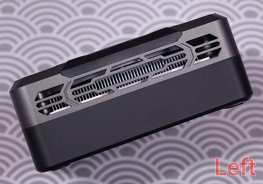 본체 전면에는 버튼(Button) 및 포트(Port)들이 배치되어 있는데, 왼쪽부터 전원 버튼, 오디오(Audio), USB 3.2 포트 2개, USB Type-C 포트 1개, 라이트 모드 버튼순으로 배치되어 있습니다. USB Type-C 포트는 USB 4.0 규격으로 썬더볼트 겸용과 함께 외부 모니터, eGPU, 전원공급 용도로도 사용할 수 있고, 라이트 모드(Light Mode) 버튼은 앞서 확인한 상단 RGB 팬의 LED 효과를 전환할 수 있는 버튼입니다. 그리고, 본체 양쪽 측면에는 역시 측면 쿨링효과를 볼 수 있게 에어홀이 처리되어 있죠.