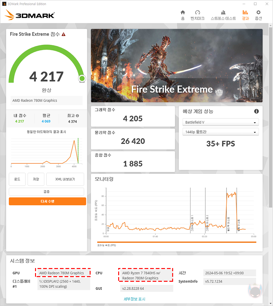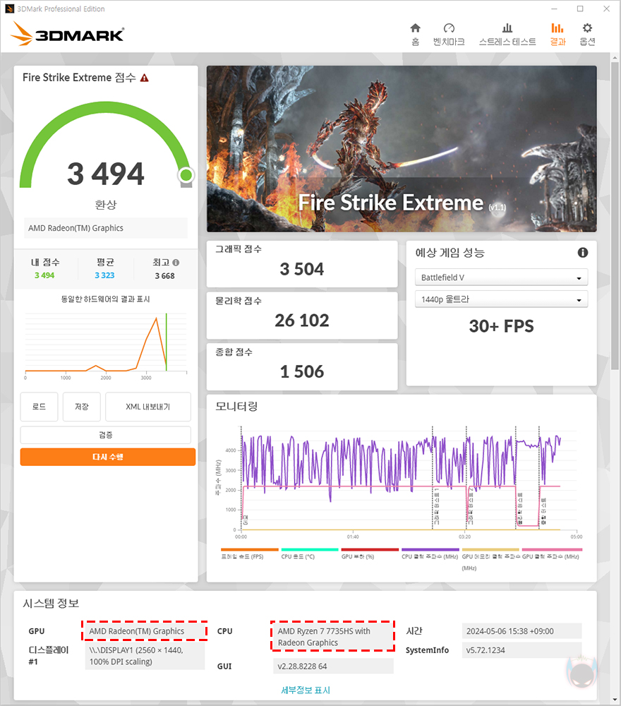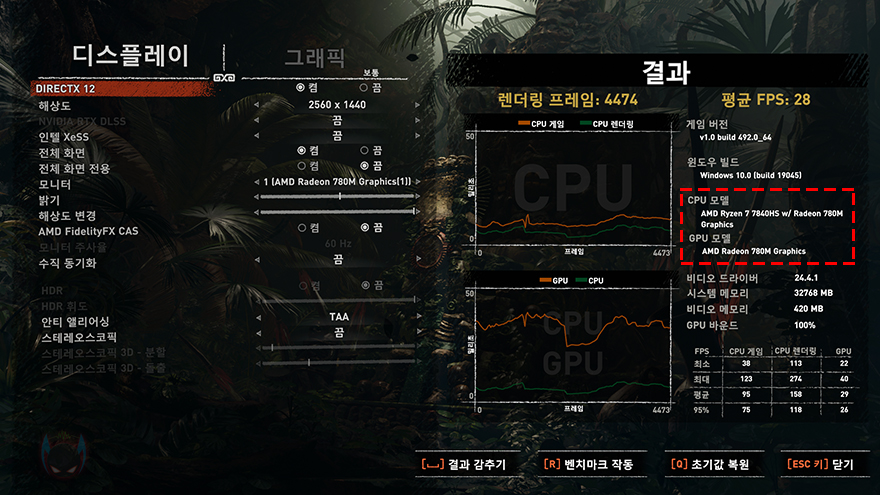 끝으로, 앞서 내장그래픽에서 언급했듯이 라이젠 7 7735HS에는 라데온 680M이, 라이젠 7 7840HS에는 라데온 780M GPU가 탑재되어 성능을 확인해 봤는데, 실제 게임 벤치마크에서는 어느 정도 차이를 보이는지도 확인해 봤습니다. 일반적으로 그동안 내장그래픽으로 게임을 한다면 해상도와 그래픽 품질에서 타협을 봐야 했는데, 라데온 780M의 성능이 꽤나 잘 나오기 때문에 QHD 해상도와 기본 게임옵션으로 비교를 해봤습니다. 비교결과, 확실히 라데온 780M 이전까지의 내장그래픽은 QHD 해상도만 높여도 상당히 성능이 떨어지는 것을 확인할 수 있는 반면, 라데온 780M은 QHD 해상도에서 성능이 낮더라도 이전 내장그래픽들보다는 확실히 높아진 것을 볼 수 있어서, 이제 게임플레이 시 타협점을 낮게 잡을 수 있고, 풀-HD 해상도에선 원활하게 플레이할 수 있음을 짐작할 수 있습니다.