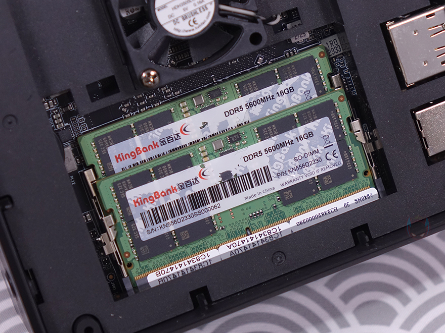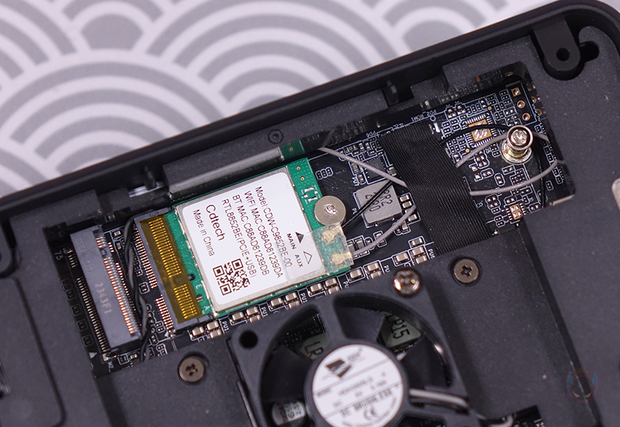 이번엔 AN3 미니 PC의 본체 밑바닥 부분을 살펴보는데, 중앙에는 에어홀 처리가 적용되어 있으며, No RAM, No Storage 옵션기준으로 앞서 언급했듯이 커버 나사가 적용되지 않은 상태이기 때문에 바로 분리가 가능합니다. 그래서, 커버를 분리해서 내부를 살펴보면, 가운데 팬을 기준으로 아랫부분에는 메모리 슬롯 2개가 배치되어 있는데, SODIMM 규격의 DDR5 메모리를 지원합니다. 그리고, 팬 기준 윗부분에는 Wi-Fi 6와 블루투스 5.2 지원의 모듈이 장착된 것을 확인할 수 있으며, 그 위에 2280 사이즈의 M.2 SSD를 장착할 수 있는데, PCIe 4.0 지원의 NVMe SSD를 지원하며 최대 2TB 용량을 지원합니다.