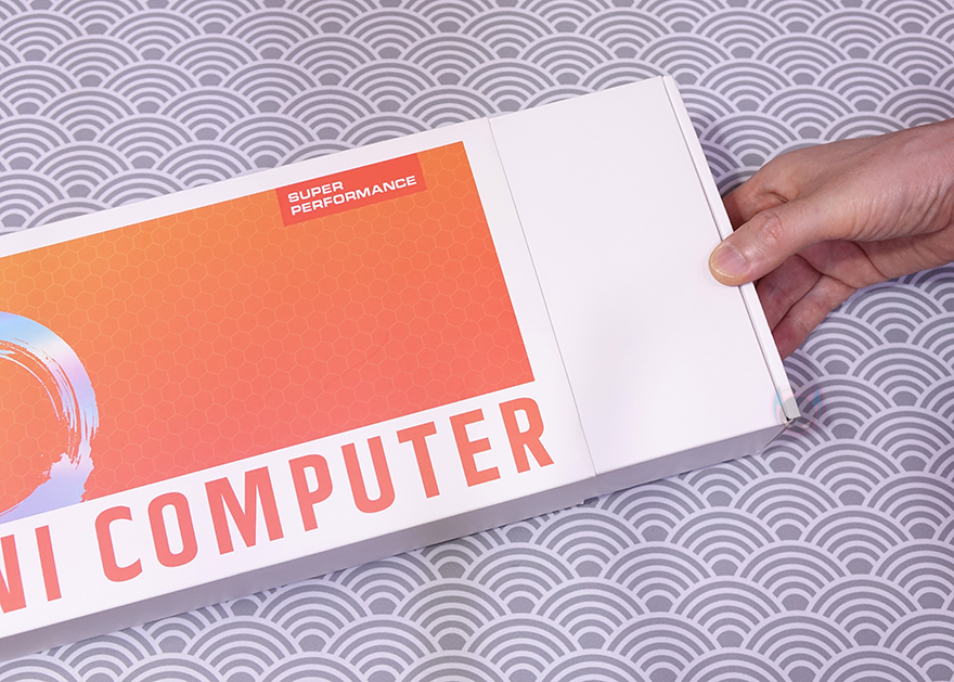제품 패키지는 심플합니다. 일단, 기존 제품들처럼 AN3 제품박스 역시 박스 전체 밀봉처리가 되어있어서 소비자입장에선 판매제품에 좀 더 신뢰를 가질 수 있으며, 박스 겉표지에는 미니 컴퓨터(Mini Computer)라는 문구와 함께 슈퍼-퍼포먼스(Super Performance)라는 콘셉트 문구도 확인할 수 있습니다. 그리고, 한쪽에는 원형 그림이 그려진 걸 확인할 수 있는데, 눈썰미가 있는 소비자라면, CPU 브랜드의 한 이미지라는 걸 알 수 있죠. 바로, AMD 라이젠(Ryzen) CPU에서 많이 보던 로고 이미지의 한 부분입니다. 뒤에서 확인하겠지만, AN3가 AN2 시리즈의 후속이기 때문에, 당연히 CPU는 AMD 라이젠입니다.