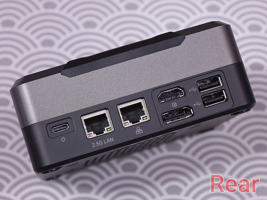 본체 후면에는 각종 포트들이 배치되어 있는데, 왼쪽부터 전원 어댑터와 연결되는 DC 포트, 랜(LAN) 포트 2개, HDMI 포트 1개, DP(Display Port) 1개, USB 2.0 포트 2개입니다. 조금 눈에 띄는 점이라면 전원 DC 포트 규격이 USB Type-C 포트 규격이라는 거죠. 그래서, 뒤에서 확인하겠지만, 전원어댑터의 연결 인터페이스 역시 USB Type-C로 갖추고 있습니다. 또한, 랜 포트 같은 경우에도 듀얼(Dual)인데, 1개는 2.5 GbE까지 지원합니다. 물론, 모니터 출력의 HDMI와 DP 포트도 4K 해상도를 지원하죠.