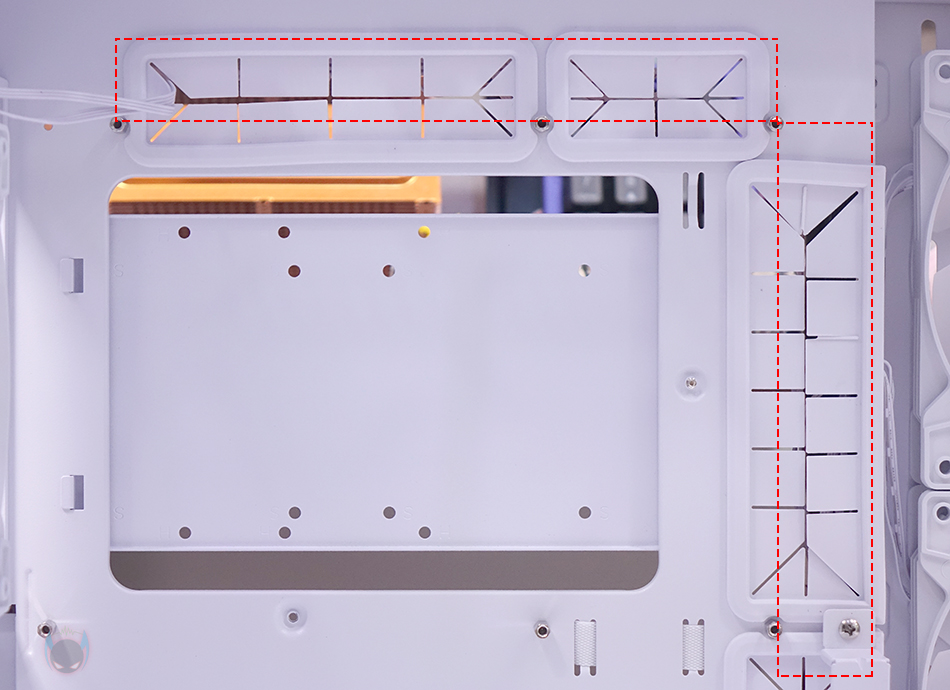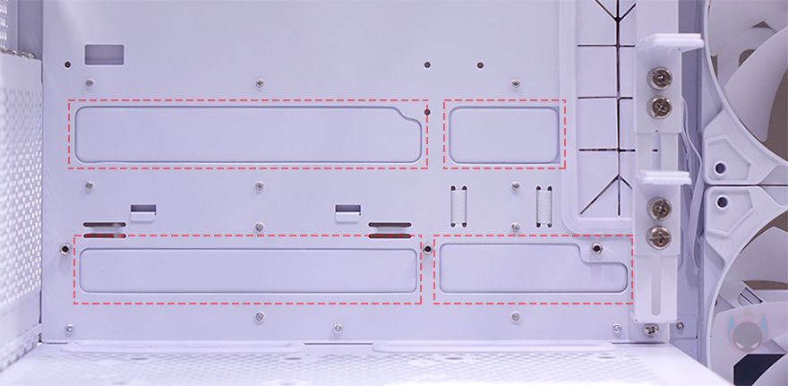 이밖에도 CPU-cut-Out 부분에는 저장장치 브라켓이 장착되어 있는데, 고정된 손나사를 풀면 쉽게 분리가 가능하고, 브라켓에는 2.5인치 HDD/SSD 2개 또는 3.5인치 HDD 1개를 장착할 수 있습니다. 그리고, CPU-cut-Out 바로 아래에도 추가 브라켓이 있으며, 이 브라켓 역시 손나사를 풀면 분리가 가능하고, 동일하게 2.5인치 HDD/SSD 2개나 3.5인치 HDD 1개를 장착할 수 있죠. 그리고, 내부 측면 쿨링시스템 부분의 후면을 보면 앞서 언급했듯이 기본 장착된 팬 외에도 120mm 팬이나 수랭쿨러 라디에이터를 장착할 수 있게 나사홀이 적용되어 있습니다.