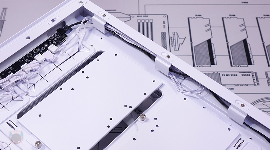 케이스 내부 뒷공간 그러니깐 메인보드 트레이 후면을 살펴보면, 측면 쿨링시스템보다 안쪽으로 들어간 상태로 선정리 공간을 확보하고 있는데, 약 30mm 공간으로 사이드패널의 공간까지 합치면 약 35mm의 선정리 공간을 확보하고 있습니다. 또한, 양쪽 공간에는 일정 간격으로 케이블을 묶어놓는 홀드 장치도 적용되어 있죠. 또한, 상단 안쪽에는 기본 제공되는 팬들을 컨트롤할 수 있는 허브가 적용되어 있는데, 팬과 ARGB 헤더 함께 갖춘 허브로 최대 5개의 팬까지 연결할 수 있습니다. 그리고, 이 허브를 통해 상단 LED 버튼을 통한 LED 모드 전환도 할 수 있죠.