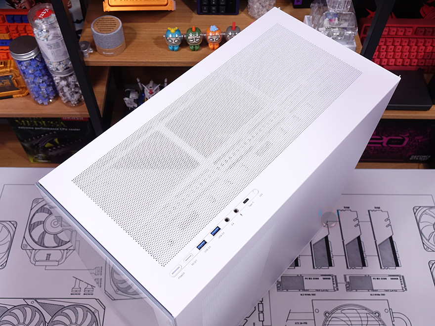 케이스 밑바닥부분에는 약 21mm의 높낮이 받침대와 함께 패드도 기본 부착되어 있으며, 밑바닥 전체를 덮는 분리형 먼지필터도 적용되어 있죠. 조금 아쉬운 점이라면 후방향에서 분리해야 합니다. 먼지필터를 분리하면 쿨링효과를 위한 벌집모양의 에어홀 처리를 확인할 수 있으며, 뒤에서 확인하겠지만, 내부 하단 앞부분에 팬 또는 저장장치를 장착할 수 있는 나사홀이 적용된 것을 확인할 수 있습니다.