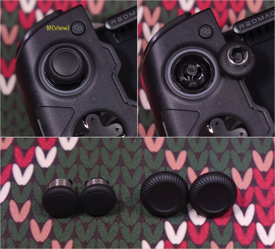 왼쪽 패드(Left Pad)부터 살펴보면, 맨 윗부분에는 뷰(View) 버튼이 배치되어 있으며, 아래에 왼쪽 조이스틱(Joystick)이 배치되어 있는데, 조이스틱 헤드(Head)부분은 분리가 가능합니다. 그래서, 앞서 구성품에서 확인한 교체용 조이스틱 헤드(Joystick Head)로 변경할 수 있는데, 왼쪽과 오른쪽 패드 각각 조이스틱이 배치되어 있기 때문에 개수에 맞춰서 제공되며, 교체용에는 기본 장착된 헤드보다 작은(small) 헤드와 오목(Concave)하게 들어간 헤드 2가지입니다. 그리고, 뒤에서 확인하겠지만, 조이스틱 주변 테두리 라인으로는 RGB 라이트닝 효과도 적용되어 있죠.