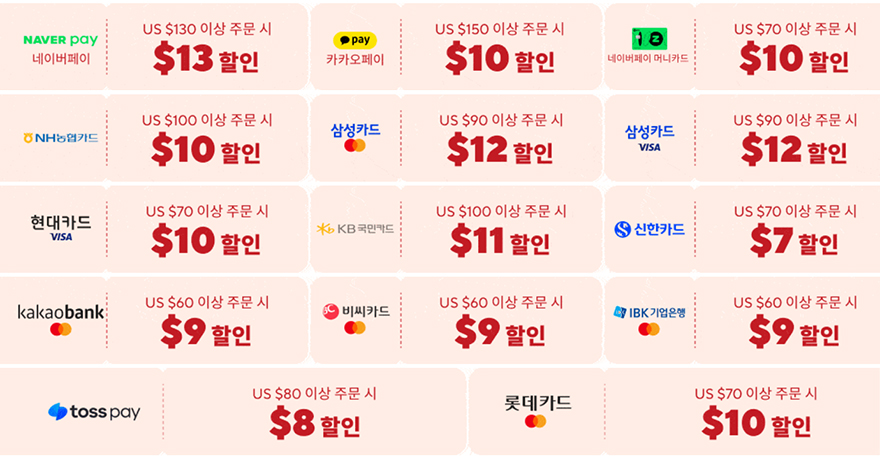 | $89달러 구매시, $12달러 할인 | AA8912 | ALIPPOM0612 | AEMEGA12 | PAYBOOC0612 |