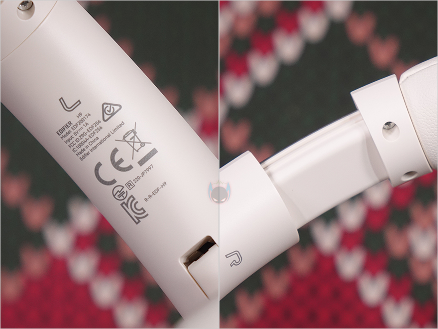 물론, 헤드밴드 양쪽으로 길이조절도 지원하는데, 스틸재질을 사용해 내구성을 높였습니다. 그리고, 길이조절 위치 밴드 안쪽으로 좌우 구분 표기를 해놨으며, 국내 KC(전기용품안전)인증도 받을걸 확인할 수 있죠. 이어 컵 부분은 90˚ 회전이 가능하며, 앞서 주요 특징에서 언급했듯이 안쪽으로 접을 수도 있어서 파우치 같은 보관함만 있으면 보관에도 용이합니다. 그리고, 착용 시 자동 각도조절이 되도록 틸트도 적용되어 있죠. 이어-컵 바깥쪽 중앙위치에는 EDIFIER 로고를 새겨놨습니다.