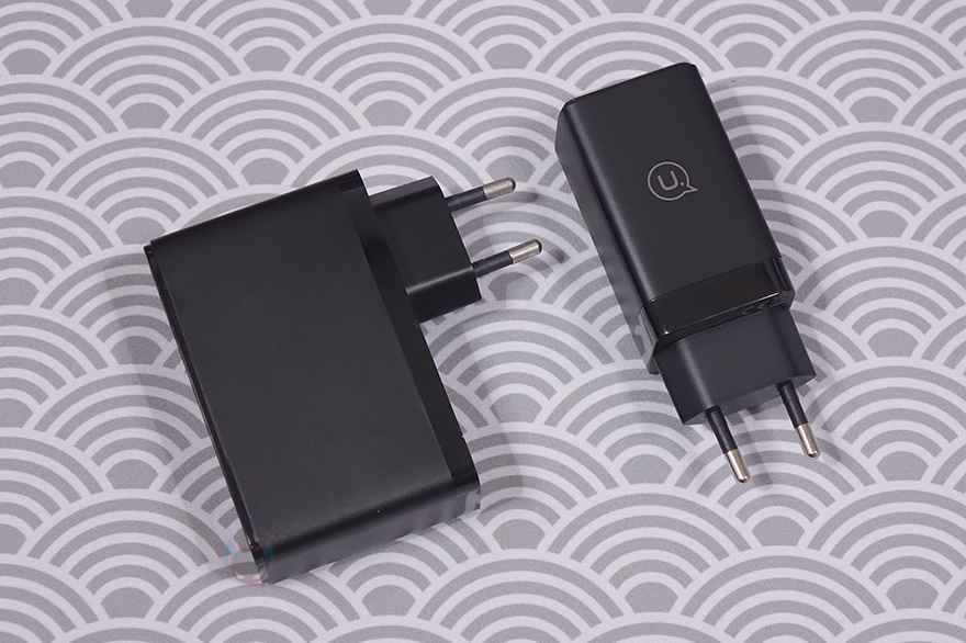 그럼, 유삼스(USAMS) 65W 고속충전기 US-CC180 모델을 살펴보는데, 앞에서 잠깐 언급했듯이 이 모델은 총 4가지 색상으로 출시되었습니다. 기본 색상이라 할 수 있는 블랙(Black)과 화이트(White)외에 그라데이션 컬러로 블루(Blue)와 핑크(Pink) 색상이 있죠. 기본적으로 블랙과 화이트이 흔하기 때문에 식상할 수 있는 소비자를 위해 추가 컬러 색상을 적용한거라 볼 수 있습니다. 그리고, 100W 고속충전기와 크기를 비교해보면, 확실히 작다라는걸 알 수 있는데, 전체 길이가 10cm정도 밖에 되지않으며, 무게도 약 2배정도 차이나서 확실히 휴대성에는 65W 충전기가 더 편하다라는걸 알 수 있습니다.