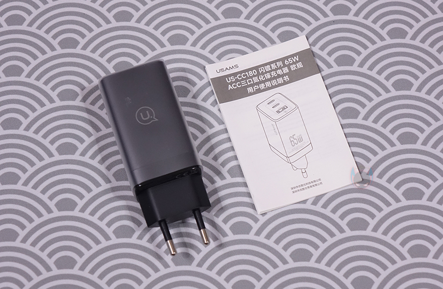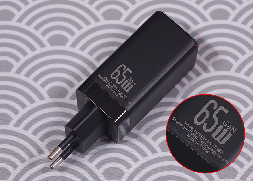 충전기를 좀 더 자세히 살펴보면, 한쪽 측면에는 USAMS 로고(Logo)를 새겨놨으며, 로고 기준 바로 오른쪽 측면에는 65W 충전표기를 해놨습니다. 그리고, 상단부분에는 USB 포트가 배치되어 있는데, 앞서 박스 패키지에서 확인했듯이, USB 포트는 총 3개 구성으로 개봉시에는 포트부분에도 보호비닐이 부착되어 있으며, 제거를 하면 무광의 메탈그레이 색상을 확인할 수 있습니다. 각 포트의 출력 지원은 싱글(Single) 1개만 사용할 때는 Type-C 포트는 최대 65W, Type-A도 60W까지 지원하며, 포트를 2개 사용할 때는 Type-C 2포트는 45+20W, Type-C1 + A 경우는 45+18W, Type-C2 + A경우는 각각 15W입니다. 그리고, 3개 모두 사용할 때는 45+15W를 출력합니다. 물론, 콘센트에 연결되는 플러그부분에 각 포트별 출력 표시를 해놨기때문에 사용전에 참고하면 되고, EU 플러그는 한국에서도 220V와 호환되죠.