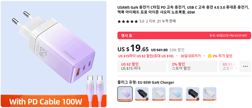 끝으로, 유삼스(USAMS) 65W 고속충전기 US-CC180 모델은 현재 알리익스프레스 공식스토어에 구입하게되면 앞서 언급한 제품 색상별로 선택했을 때 100W 고속충전기 케이블도 함께 주는데, 이때 케이블도 충전기 색상에 맞춰서 함께 제공해주니 깔맞춤을 선호하는 소비자라면 참고하면 좋겠습니다.